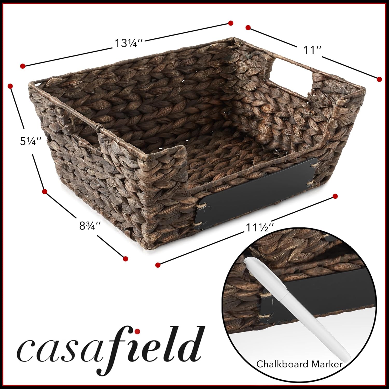 Casafield Set of 2 Water Hyacinth Pantry Baskets with Handles, Chalkboard Labels, and Marker - Espresso, Wide Woven Storage Bin Organizers for Kitchen Shelves