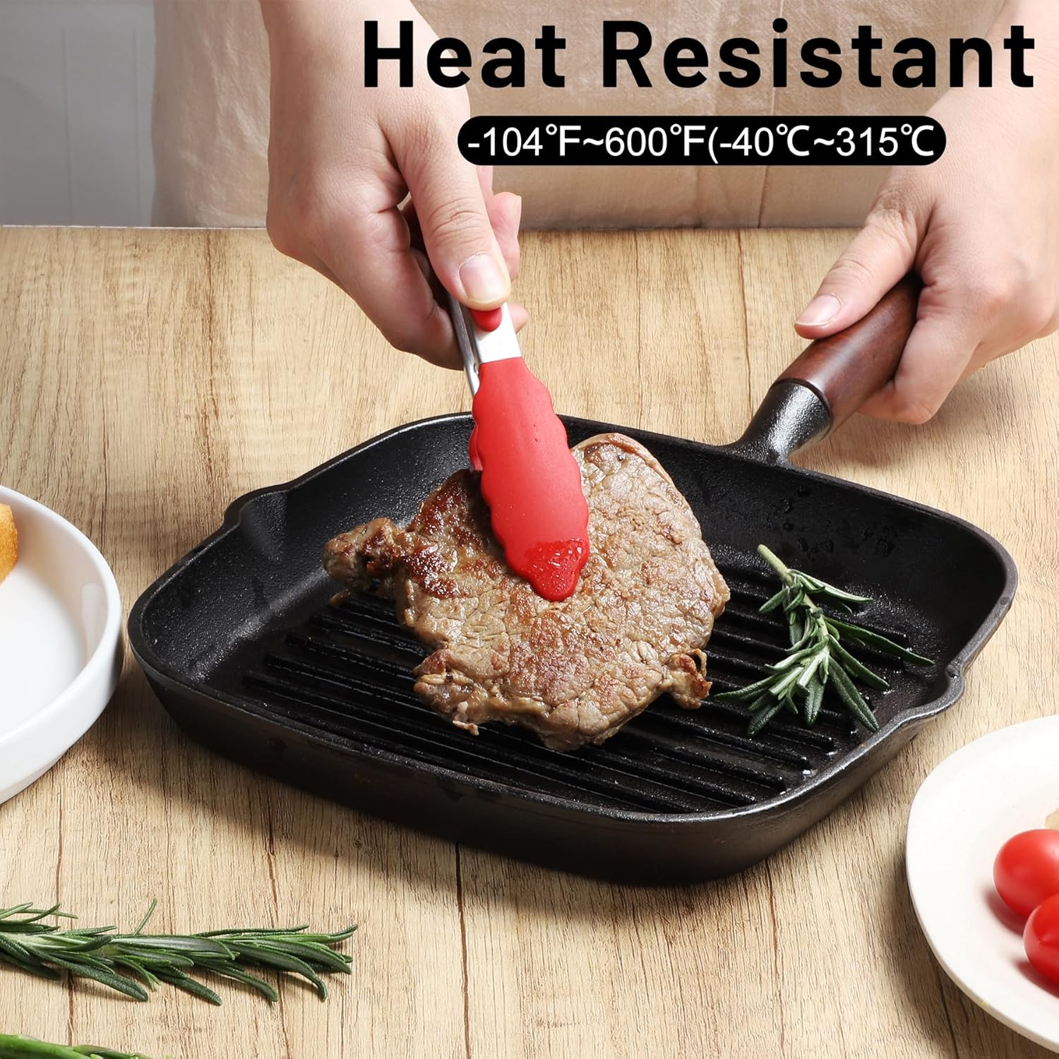 - EASY TO USE: The cooking tongs' handle is cushioned with silicon, good for thumb rest and ensures good grip and control. The Food Grade silicon tongs tip is heat resistance 600°F and less prone to scratch the pan. Easy to rinse, dishwasher safe.