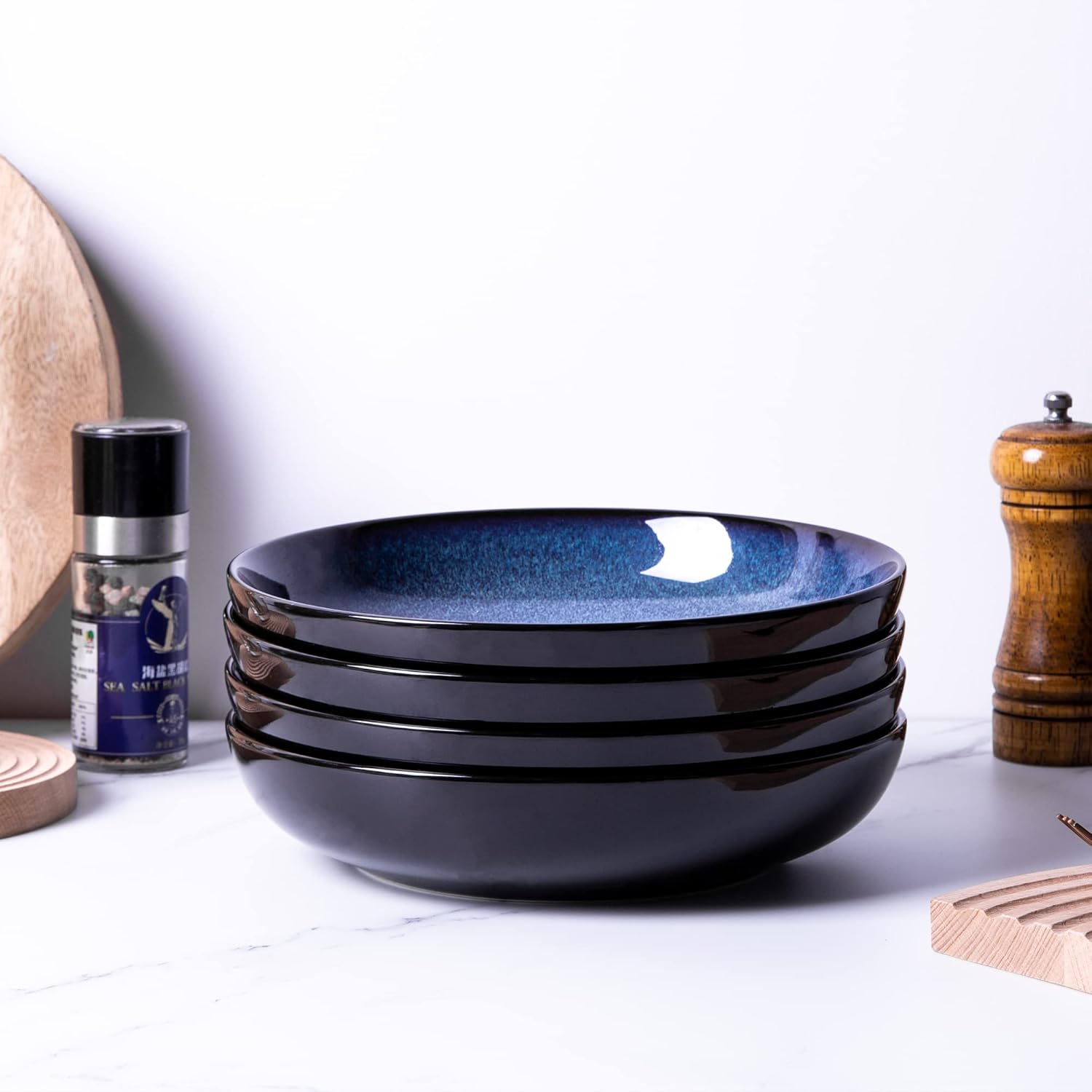 - 【ELEGANT AND Four COLOLS DESIGN】 This collection leads the dining trend with its expressive colors and finishes. The striking reactive glaze and rich, vivid tones not only soothe the senses but also enhance your dining experience. They are very big, so you have plenty of room for all the food you want to put on it. Their bottoms are flat to allow food to be easily cut in the bottom of the bowl with the dinner knife,this is great for making sure that nothing is spilled off the edge.