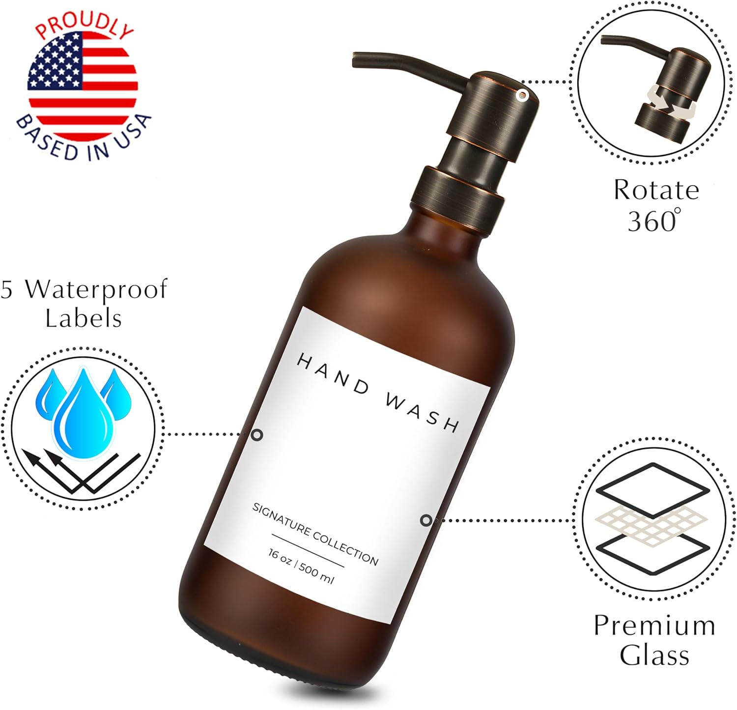 - ✅ 5 WATERPROOF LABELS: Now with 5 stickers, it's your choice to use the Kitchen Soap Dispenser Set with Dish Soap for hand soap, dish wash, lotion, conditioner, or shampoo. To clean the lotion dispenser set for the bathroom and kitchen sink soap dispenser set, just run the bottle under water and watch any residue simply wash off. With our exclusive no-leak pump, the bottle enables you to put out a good amount of soap with a single pump.