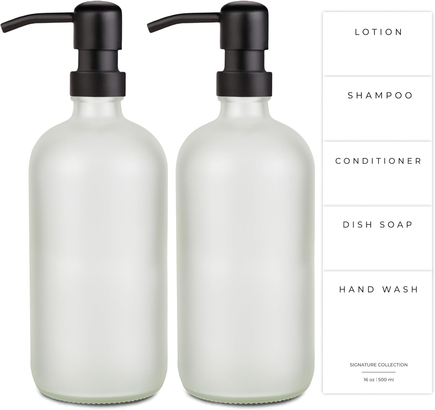 Emerson Essentials Glass Soap Bottle Dispensers, 2 Pack, Stainless-Steel Pumps Rust-Free, Hand Set for Bathroom Kitchen Sink, Liquid Lotion Shampoo Jars with 4 Waterproof Labels, 16 Oz Frost/Black