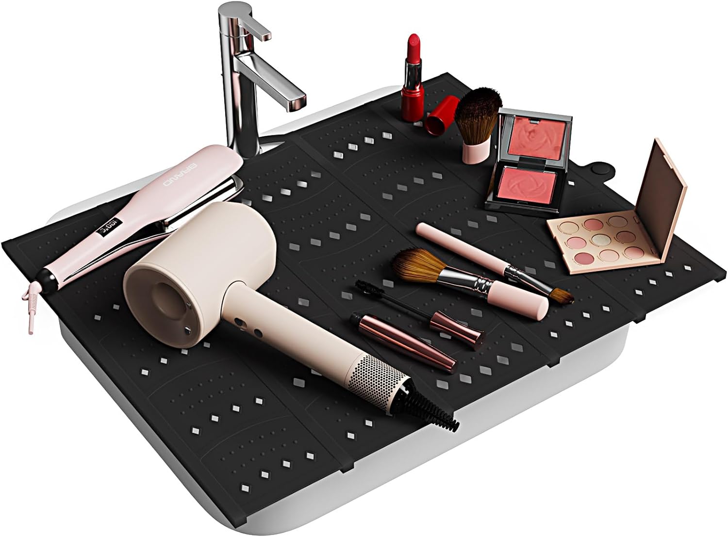 Bathroom Sink Cover for Counter Space, Sink Mat Foldable Sink Cover, Silicone Makeup Organizer Mat Space Saver, Small Bathroom & Rv Camper Travel Must Haves Accessories, Black