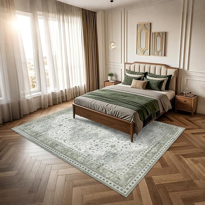 Area Rug for Living Room - Indoor Vintage Machine Washable Rug for Bedroom Dinning Room Office - Floor Carpet Non-Slip Backing Rugs Floral Soft Low-Pile (Sage Green, 5' × 7')