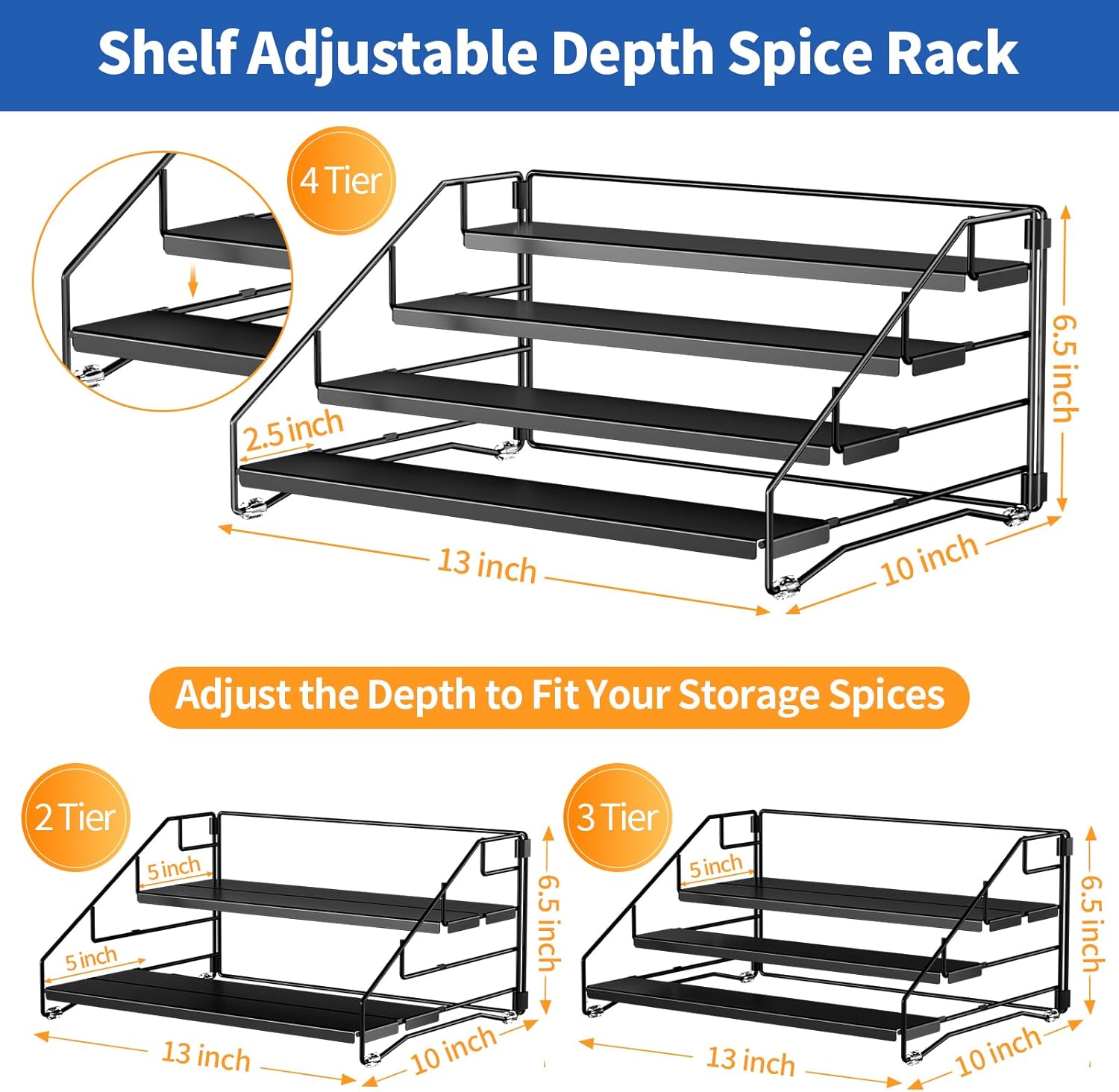 - Adjustable Depth Design, Rationalisation of Space: The spice rack organizer adjustable depth, 4 shelf can be combined to adjust the depth at will. Adjust the depth according to the size of spices you are storing, making efficient use of cupboard space. The perfect storage solution for multi-size spice jars. Note: Jars not included.