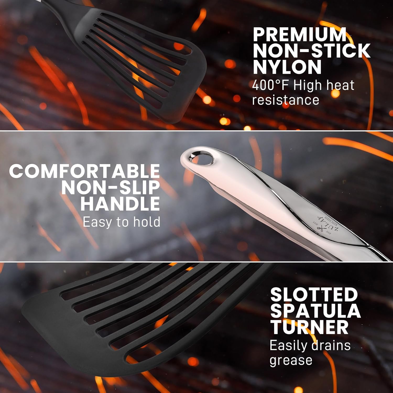 - SLOTTED DESIGN FOR DRAINING: Slots in the head allow grease to drain away efficiently, promoting healthier cooking by reducing excess oil.