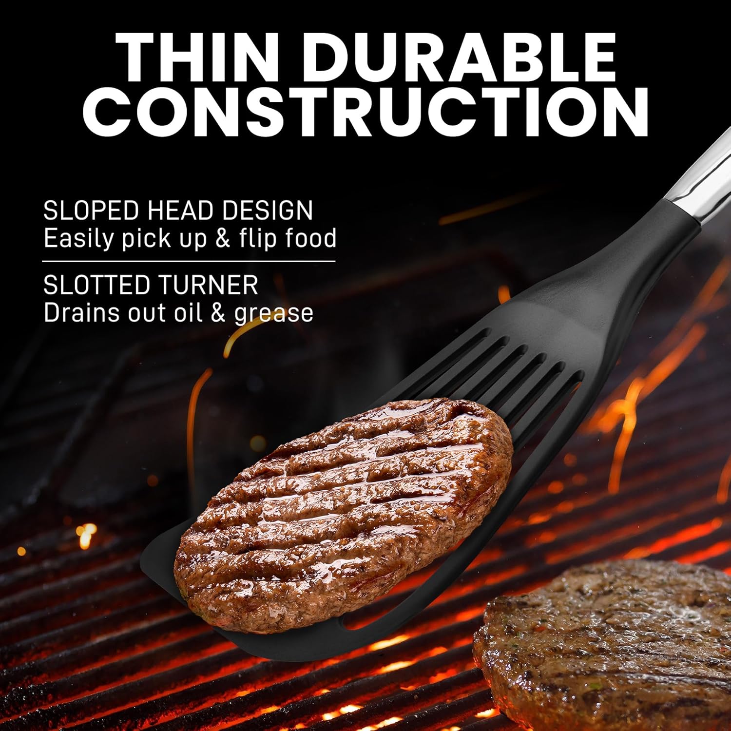- SLOPED HEAD DESIGN: The sloped head design makes it easy to pick up and flip food, offering excellent control and maneuverability.