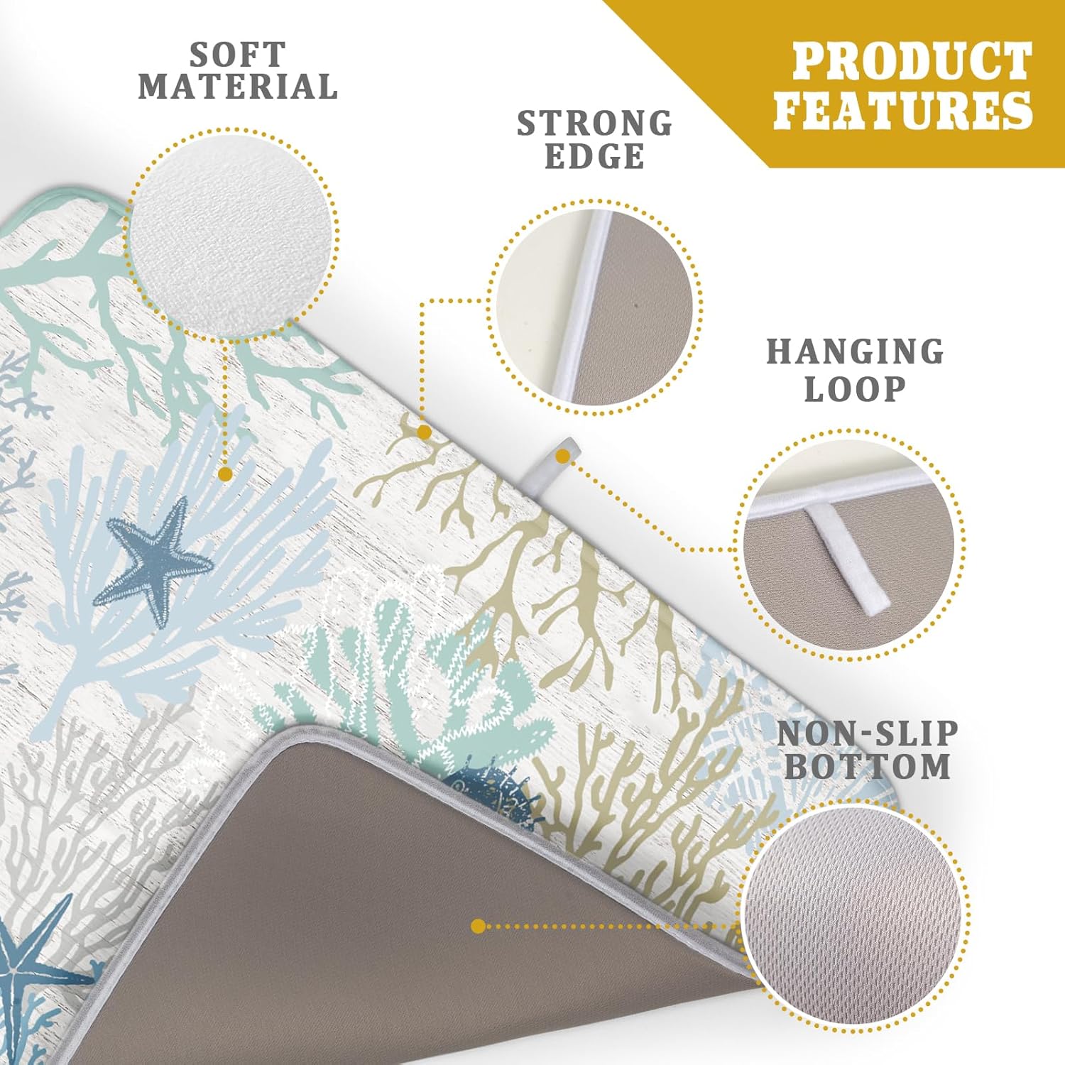 Blue Coral Dish Drying Mat Coastal Starfish Dishes Pad Hanging Drainer Mats Reversible Absorbent Kitchen Counter Protector 18x24 Inch