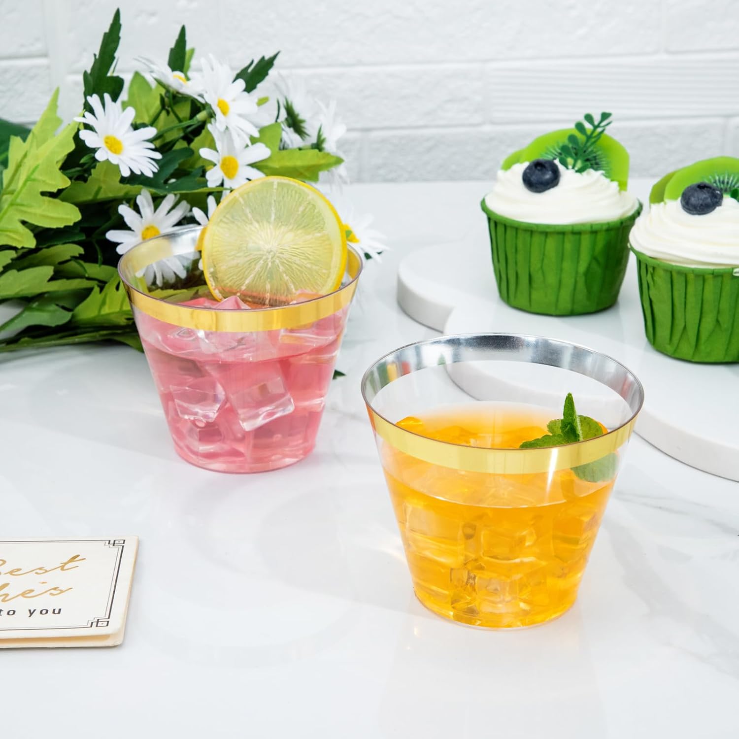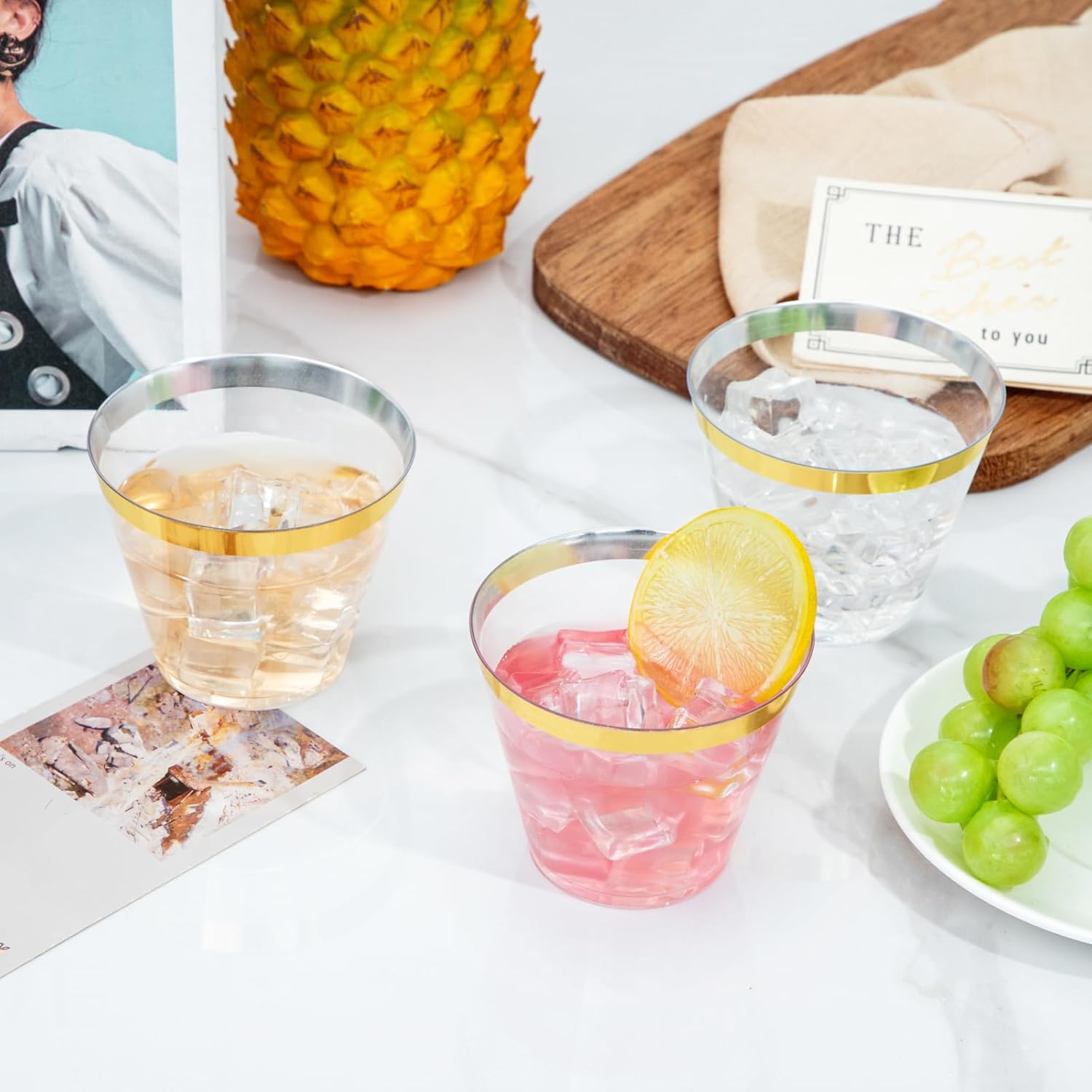 - Elegant Appearance: The 9 oz disposable clear plastic cups with gold trim are crystal clear all over, presenting a high-end appearance for a good clear visibility. The gold appearance and luster make these gold rimmed plastic cups look more upscale in any setting.