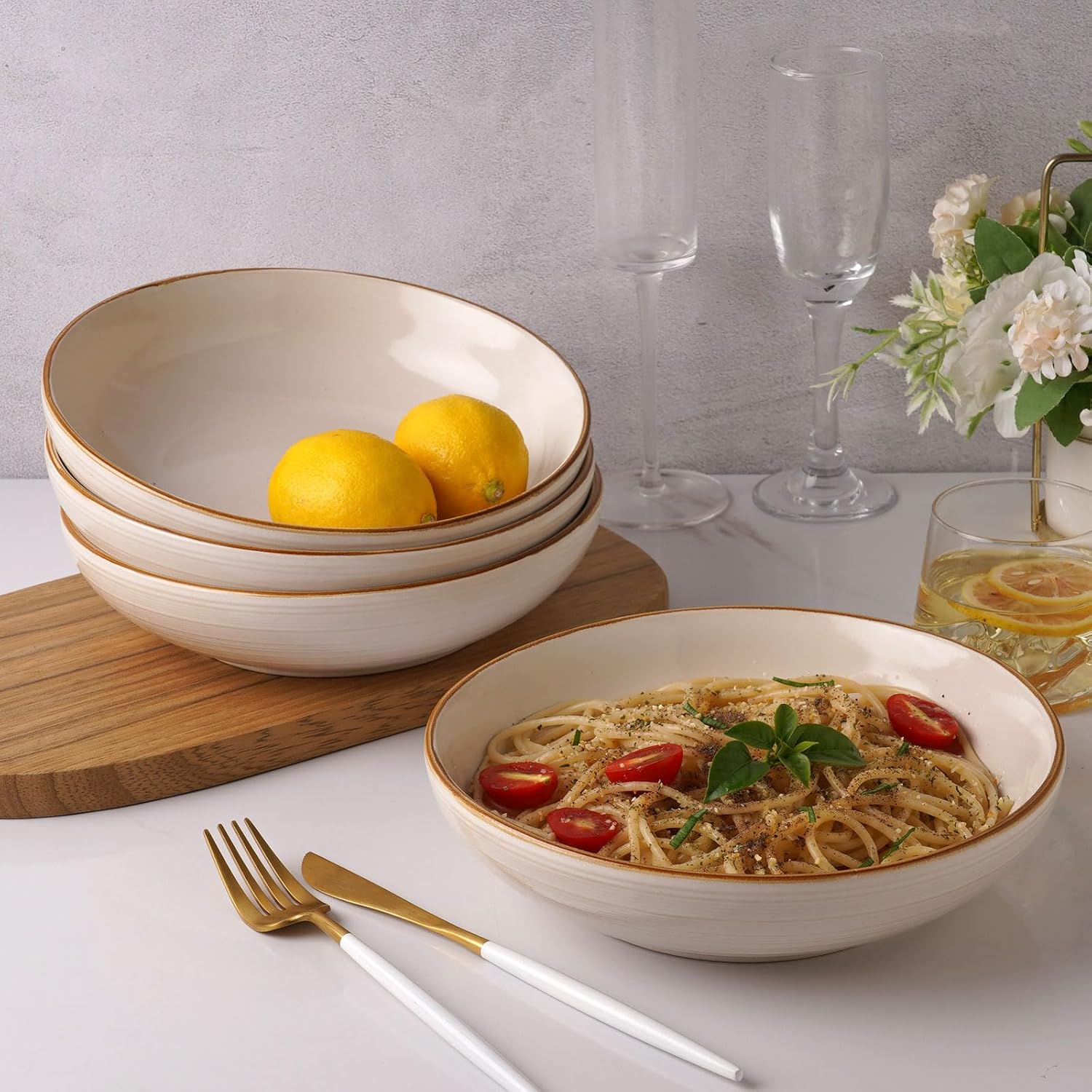 famiware Tempus 8.6'' Pasta Bowls Set of 4, 40 oz Bowls for Kitchen, Stoneware Deep Serving Bowls, Dishwasher & Microwave Safe Bowls for Cereal, Salad, Soup, Dessert etc - Antique White
