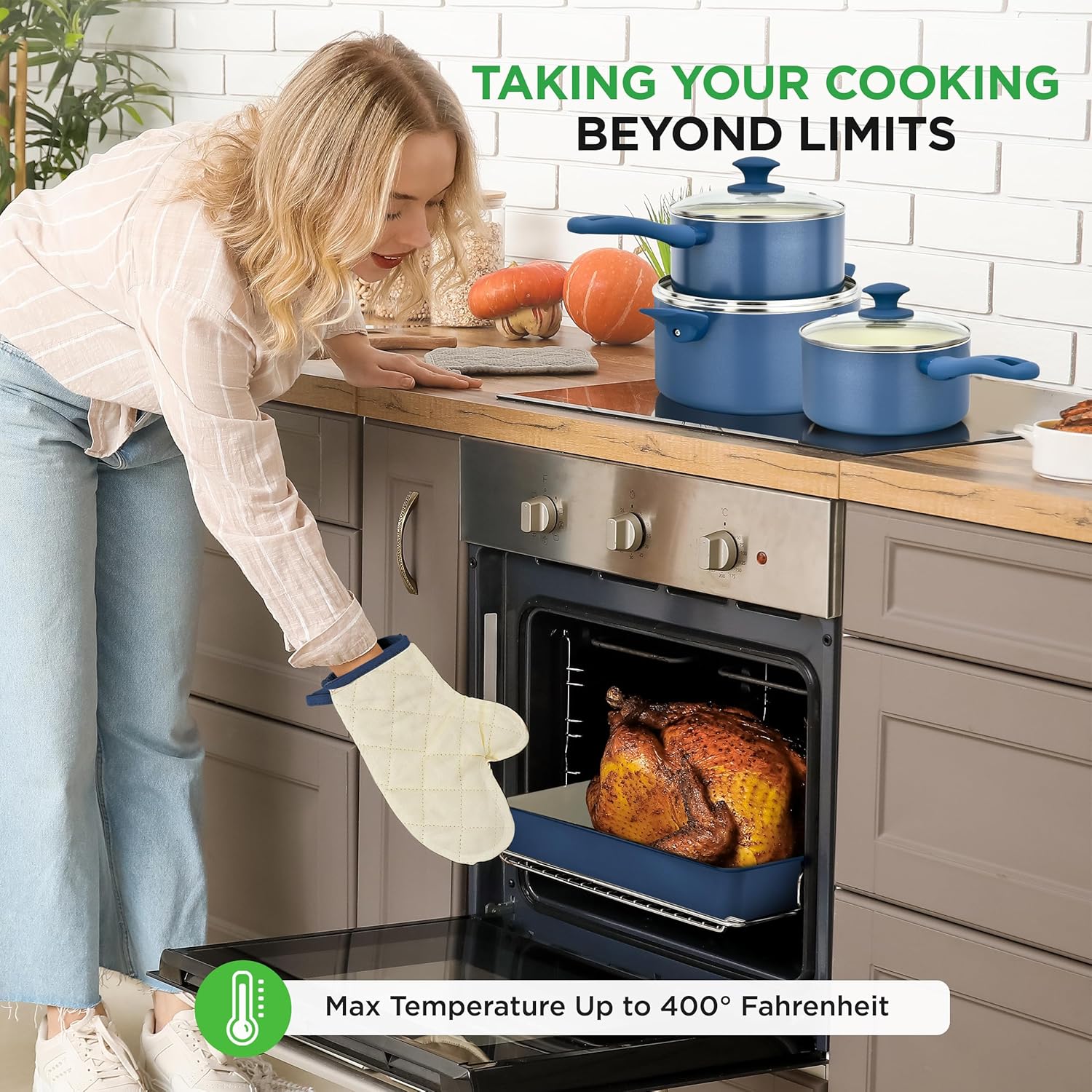 - USER-FRIENDLY DESIGN - Embrace eco-conscious cooking with our non-toxic, food-grade and user-friendly kitchenware. The pots and pans nonstick set is constructed with care, ready to use for gas, electric, ceramic, and induction (excluding the small egg pan and milk pot) counter cooktops.