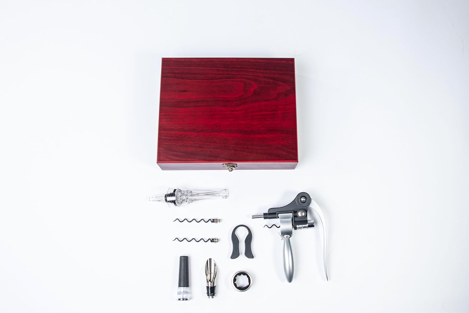 Wine Bottle Opener Set with Accessories Polished Silver in Wood Box, Aerator, Extra Screws, Foil Cutter, Pourer, Vaccu Stopper, Winged Wine Opener, Rabbit Red Wine Corkscrew Set (Polished Silver)