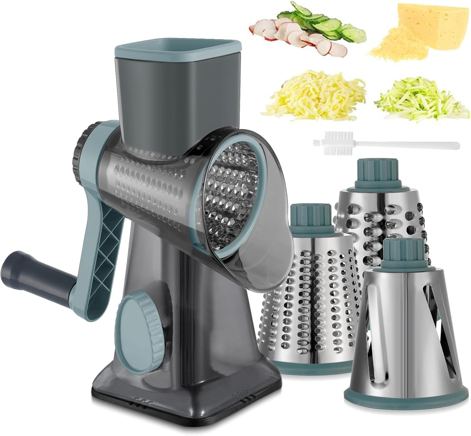 Cheese Grater Hand Crank Rotary Vegetables Shredder with Handle, 3-in-1 Graters with Interchangeable Blades and Strong Suction Base Multifunctional Slicer for Kitchen
