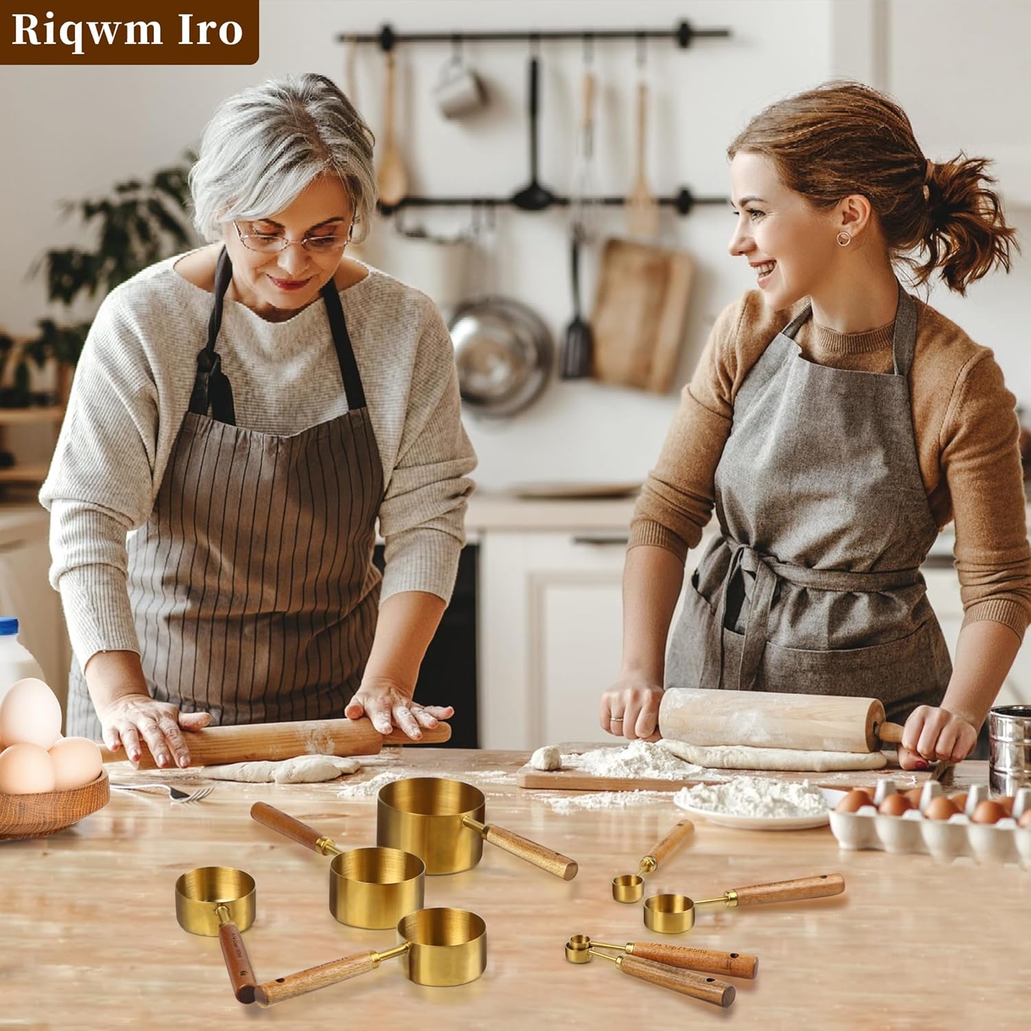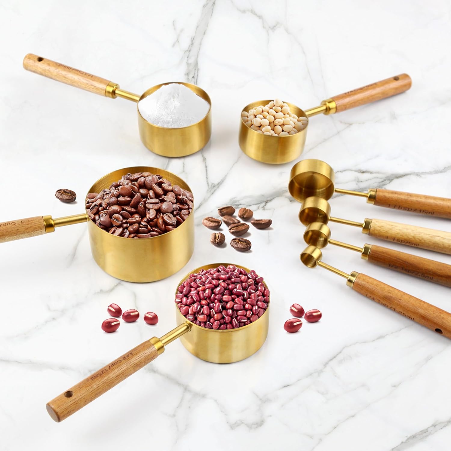 Gold Measuring Cups and Spoons Set,8 Piece Premium Stainless Steel Measuring Cups with Wood Handles,4 Stackable Wooden Measuring Cups and 4 Measuring Spoons Set for Baking Supplies in the Kitchen