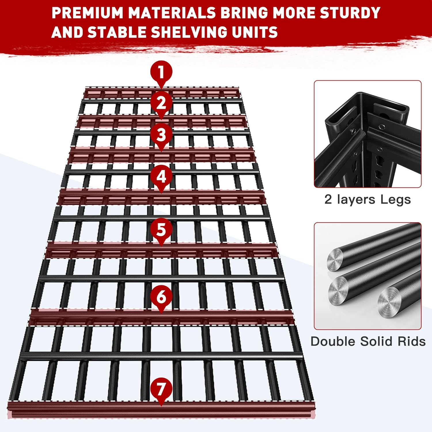 - 【3010LBS Capacity Garage Shelving】The REIBII garage shelving heavy duty adopts thickened double-layer columns, featuring with 7 reinforcing ribs for each metal shelf. What's more, every layer can withstand a weight of 602 pounds, offering a total load capacity of 3010 lbs. Such strong load-bearing capacity and high-quality metal materials make this metal shelving unit more sturdy and stable than the flimsy MDF storage shelf