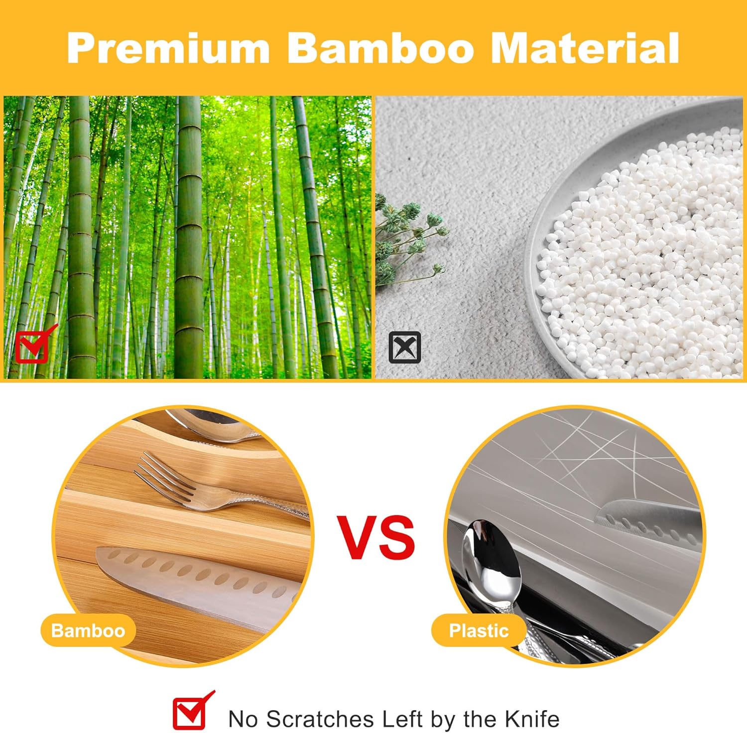- ✅【Sturdy and Well-made】Our silverware tray for drawer is made of minimally refined natural bamboo, a renewable, sustainable source, making them a green choice, with the age of over 4 years, which makes the silverware holder durable enough for long time use. Unlike the plastic and metal drawer organizer, our flatware & utensil is water & odor resistant, the silverware organizing tray is perfect for years of use, especially in kitchens where things can get messy quickly.
