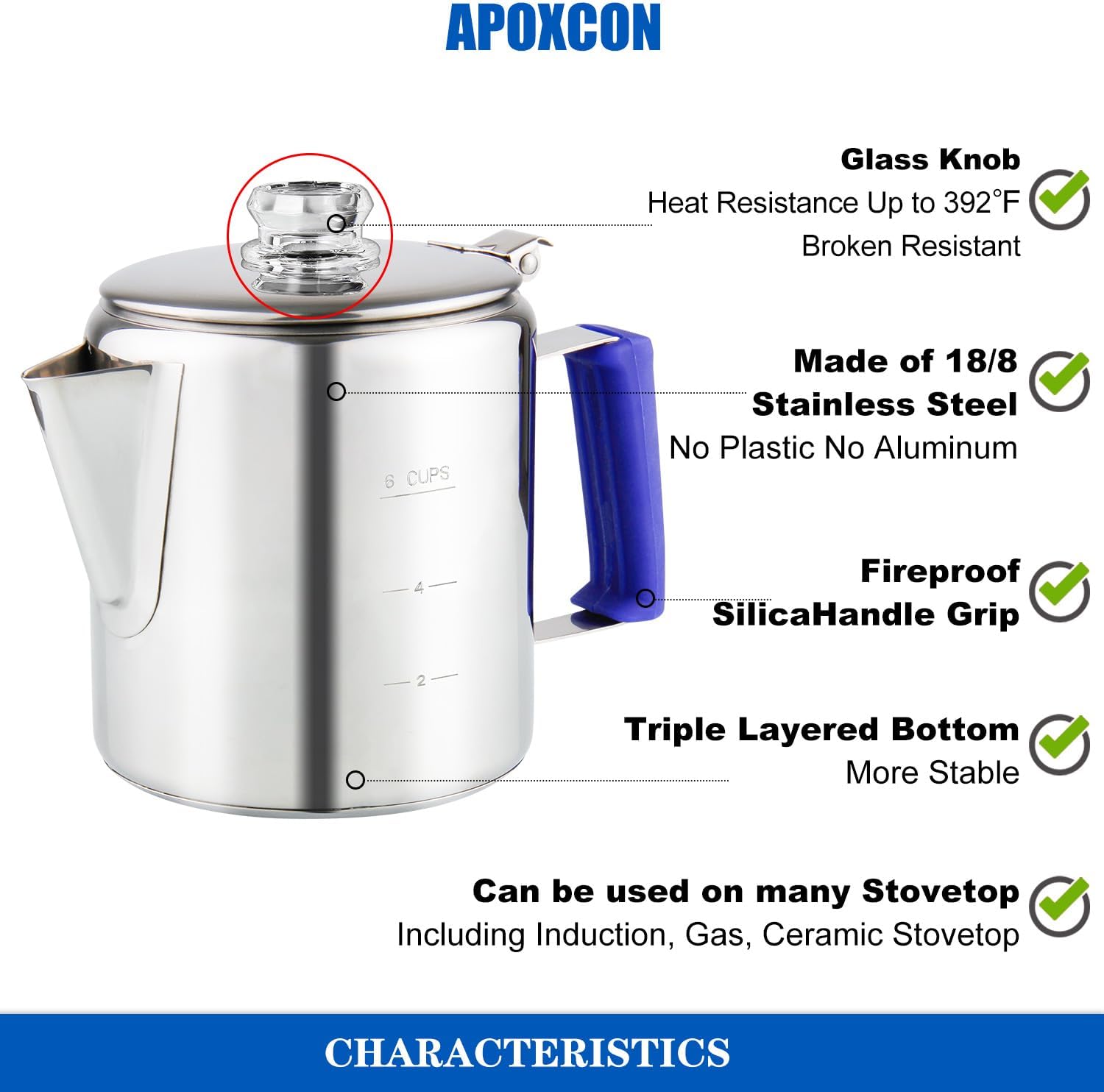 - 【OUTDOOR AND INDOOR USE】 This coffee percolator is designed for outdoor and indoor use. It’s suitable for induction cooker, ceramic electric stovetop and gas stovetop, as well as grills and campfires.