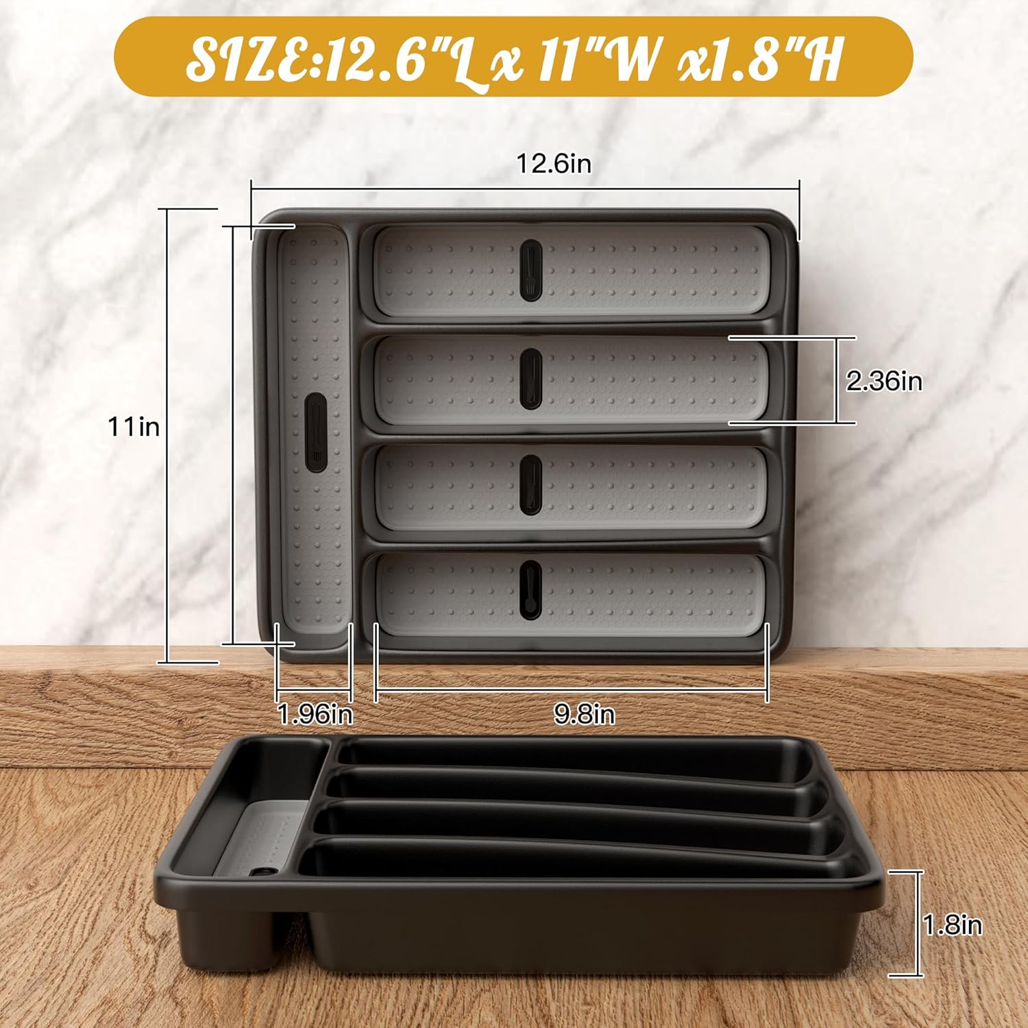 - Spacious Silverware Organizer for Drawers Maximize drawer space with 5 compartments (4 vertical slots: 10.63" x 2.56" + 1 horizontal slot: 11.4" x 2.36"). Perfect as a silverware drawer organizer for forks, knives, spoons, or a kitchen drawer organizer for spatulas, tongs, and cooking tools. Slim 1.8” height fits drawers as compact as 12.99" x 11.43"—ideal for kitchens, bathrooms, or bedrooms.
