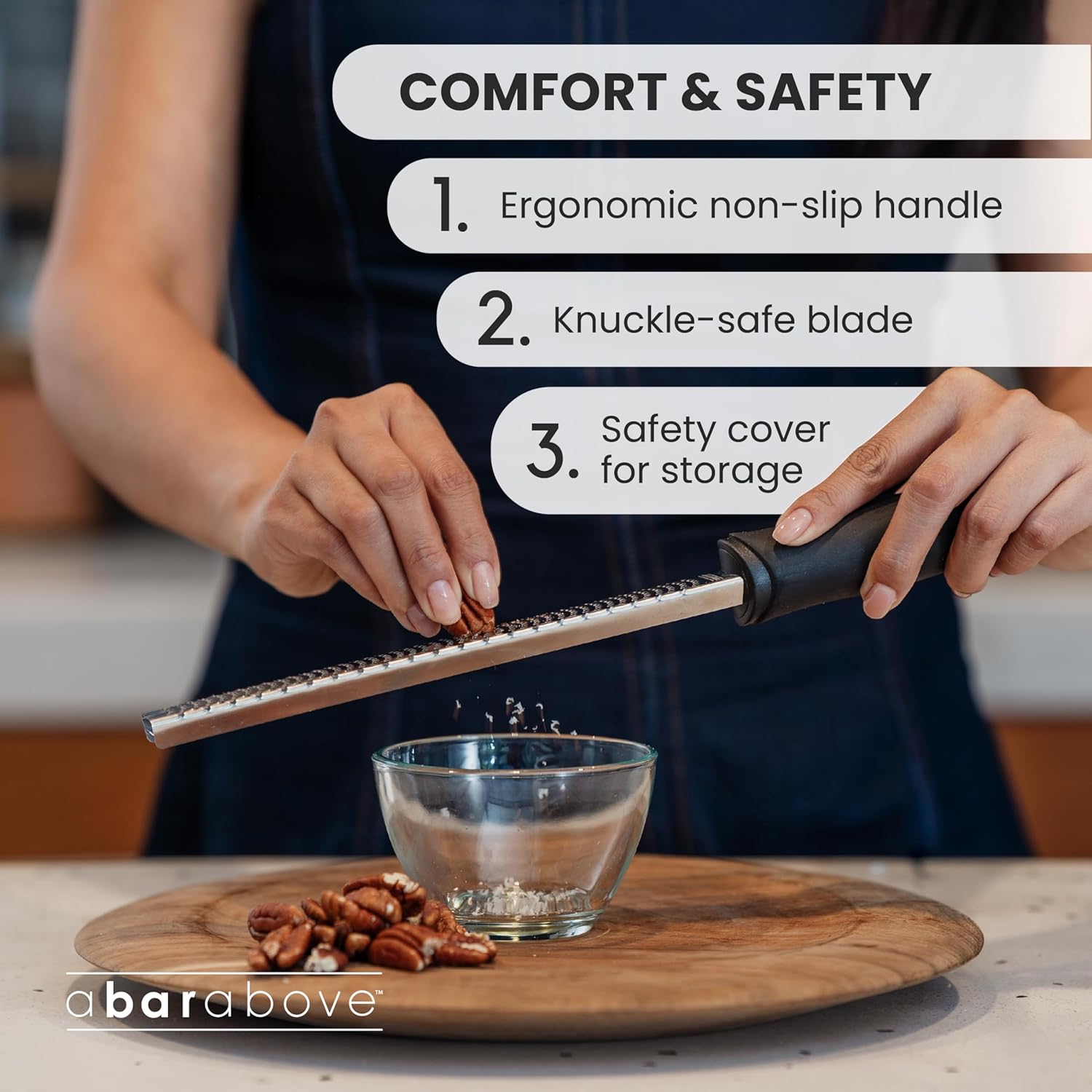 - BACKED BY A BAR ABOVE: Most graters feel like disposable gadgets, but this blade is different because it was designed in California by a professional bartender and built with the craftsmanship pros demand. More than a kitchen upgrade, it is a precision tool for people who care about doing things right. Packaged in a premium kraft box, it makes an impressive gift and comes backed by USA based customer support plus A Bar Above’s full commitment to quality. Use it once and you will never go back.