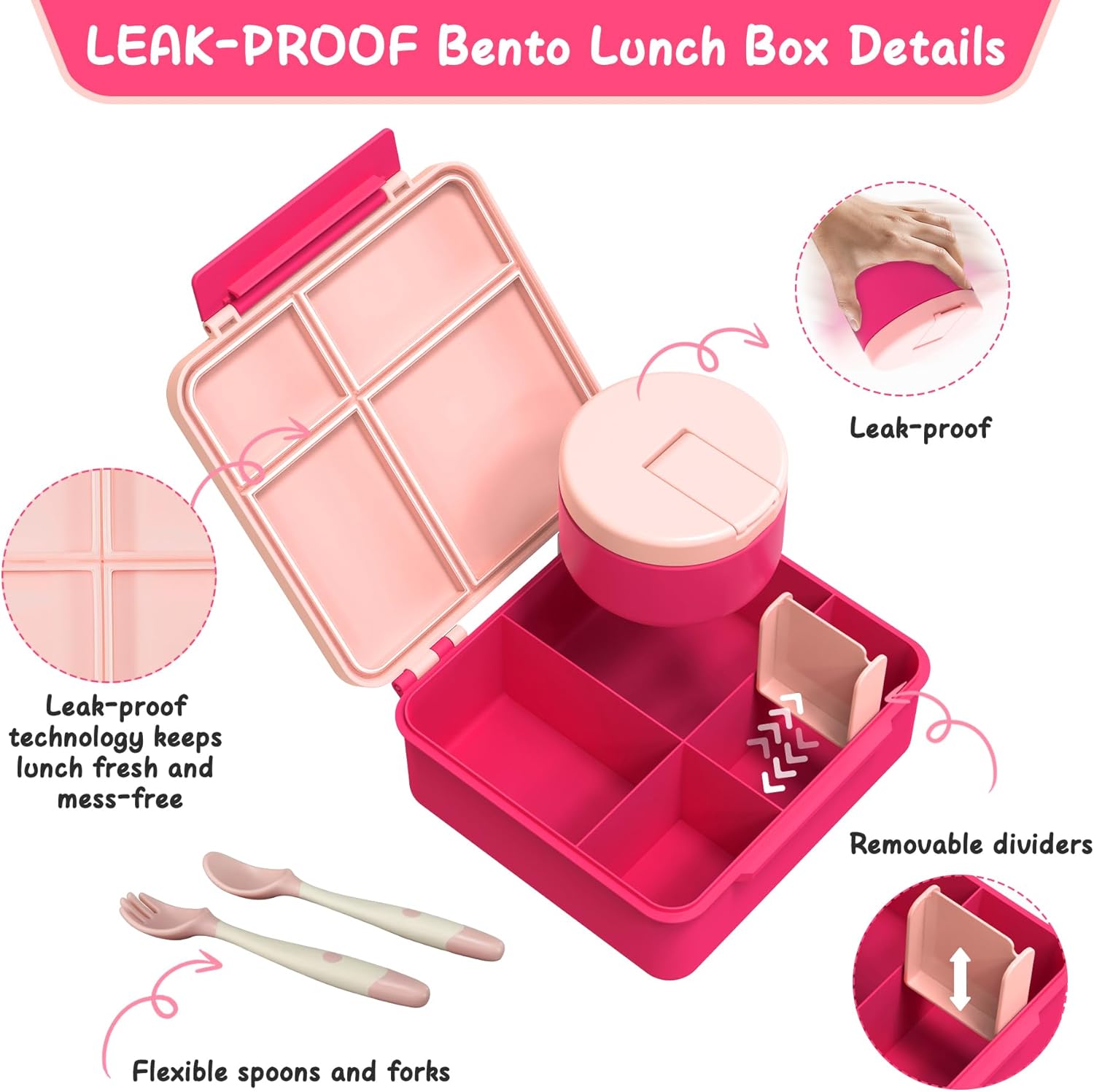 Bento Lunch Box with 8oz Soup Thermo, Leak-Proof Lunch Containers with 4 Compartment, Thermo Hot Food Jar and Insulated Lunch Box for School Pink