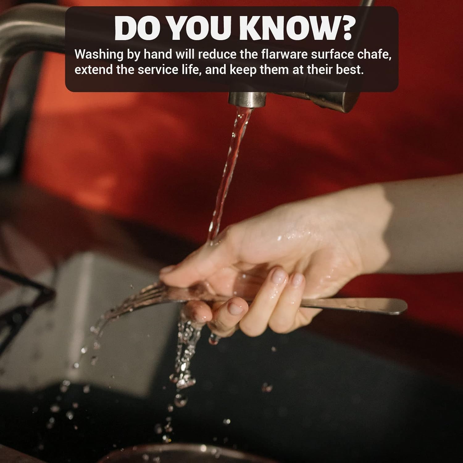 - Tips: Satin flatware never needs polishing. Hand wash recommended, dry them before storing to prevent water spots or potential corrosion. Do not use steel wire brush, hard sponge,cleaning cloth or any other hard-material cleaning tools for cleaning to avoid damage to the silverware