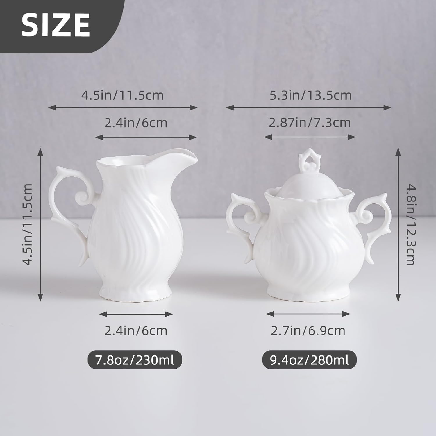 - Reasonable Size:Creamer Pitcher: 2.4" Dia x 4.5”H, capacity of about 7.8oz, Sugar Jar: 2.87" Dia x 4.8”H,capacity of about 9.4oz
