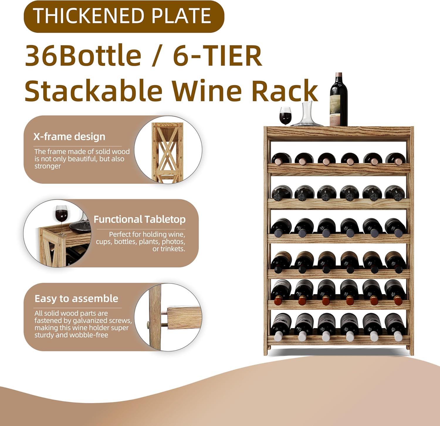 Solid Wood Wine Storage Racks - Stackable Wine Rack with Tabletop, Free Standing Floor Wooden Wine Rack, Premium Wine Storage Rack Display and Organizing for Kitchen and Cellar 6 Tier 36 Bottles