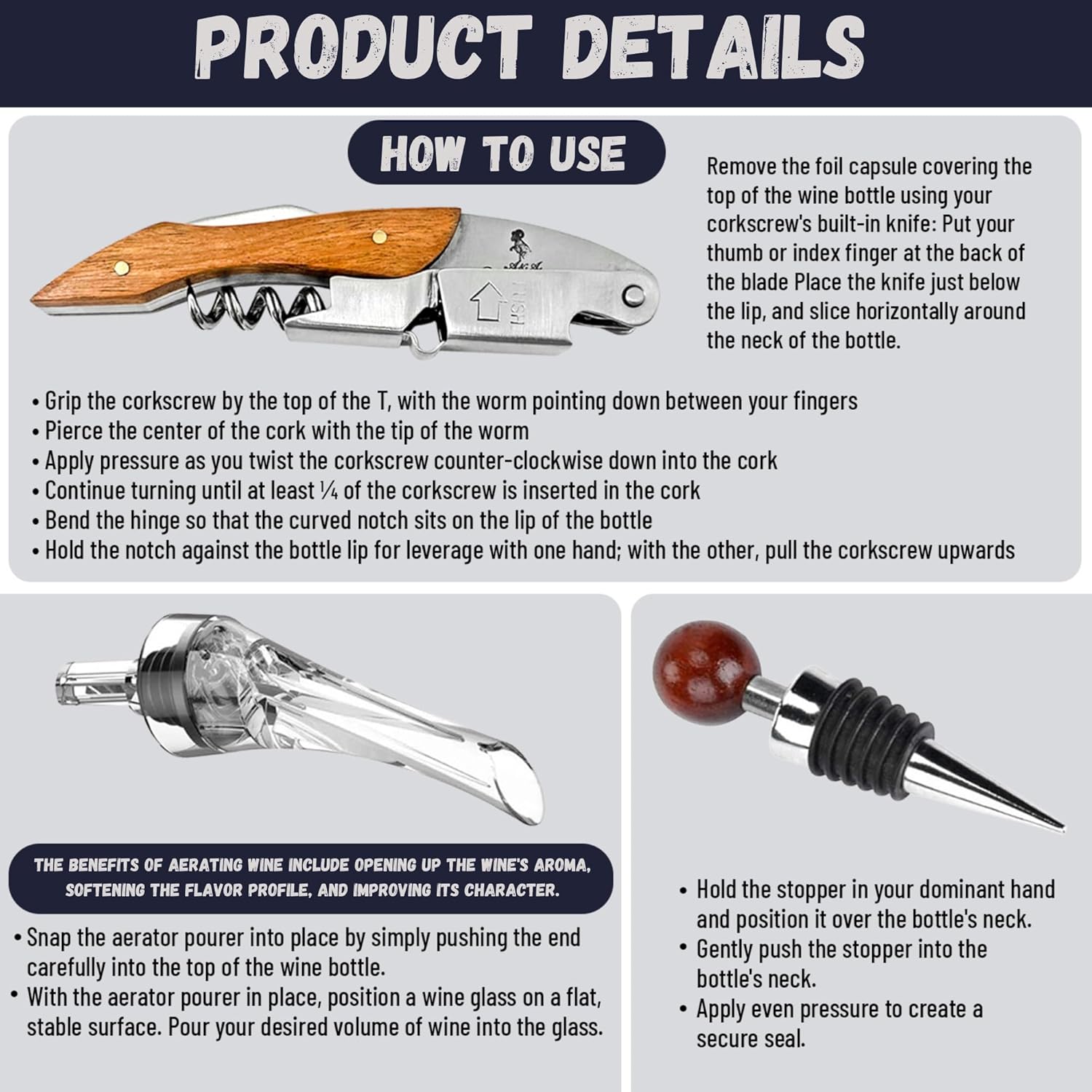 - PERFECT GIFT: Whether you're a wine connoisseur or just starting to explore the world of wine, our all-in-one set is the perfect gift for any wine lover. Its elegant design, premium quality, and multifunctionality make it a must-have accessory for any wine-drinking occasion.