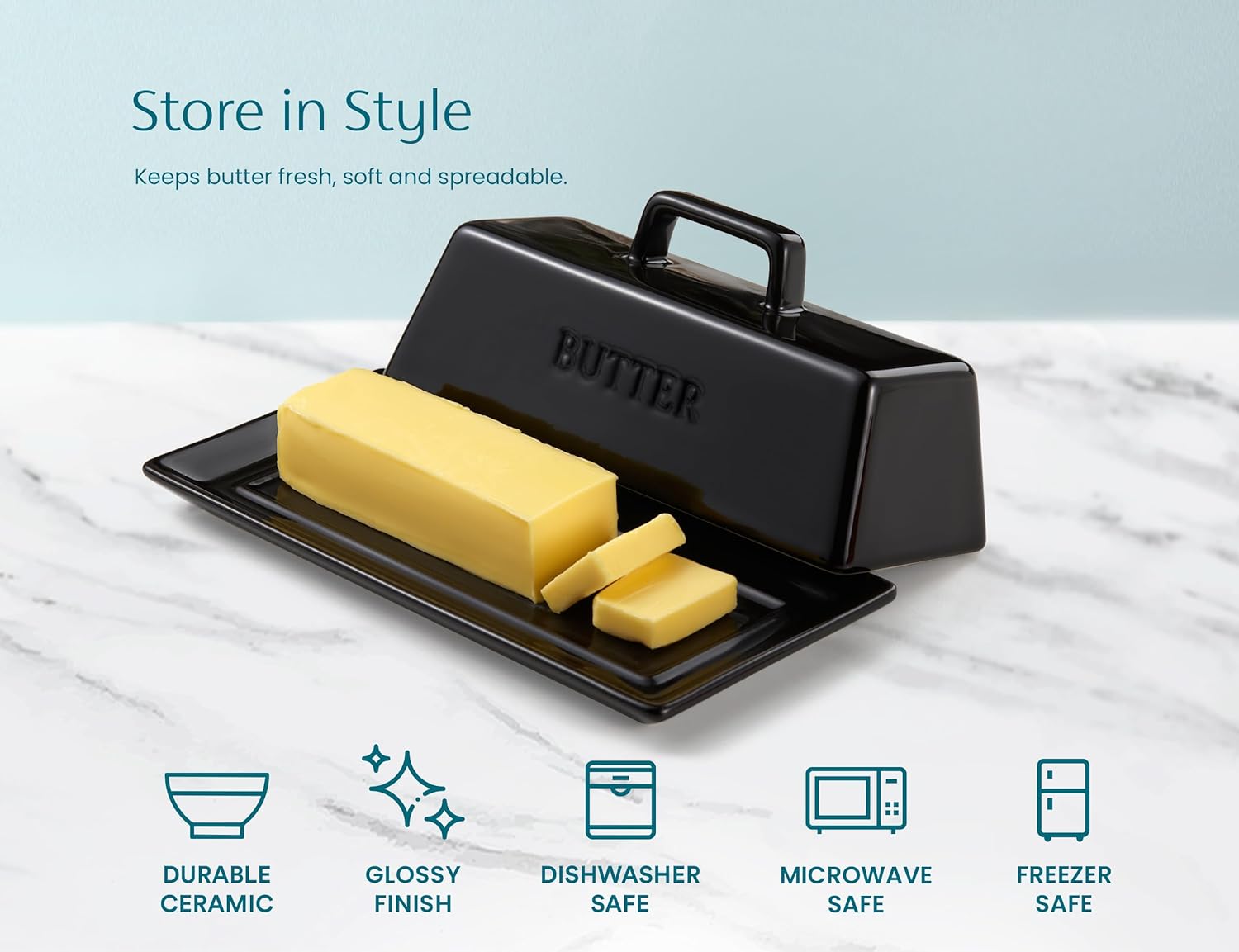 - Durable Ceramic: Classic, sturdy, and holds one standard stick. Pop into the microwave to soften butter and right into the dishwasher for easy cleanup