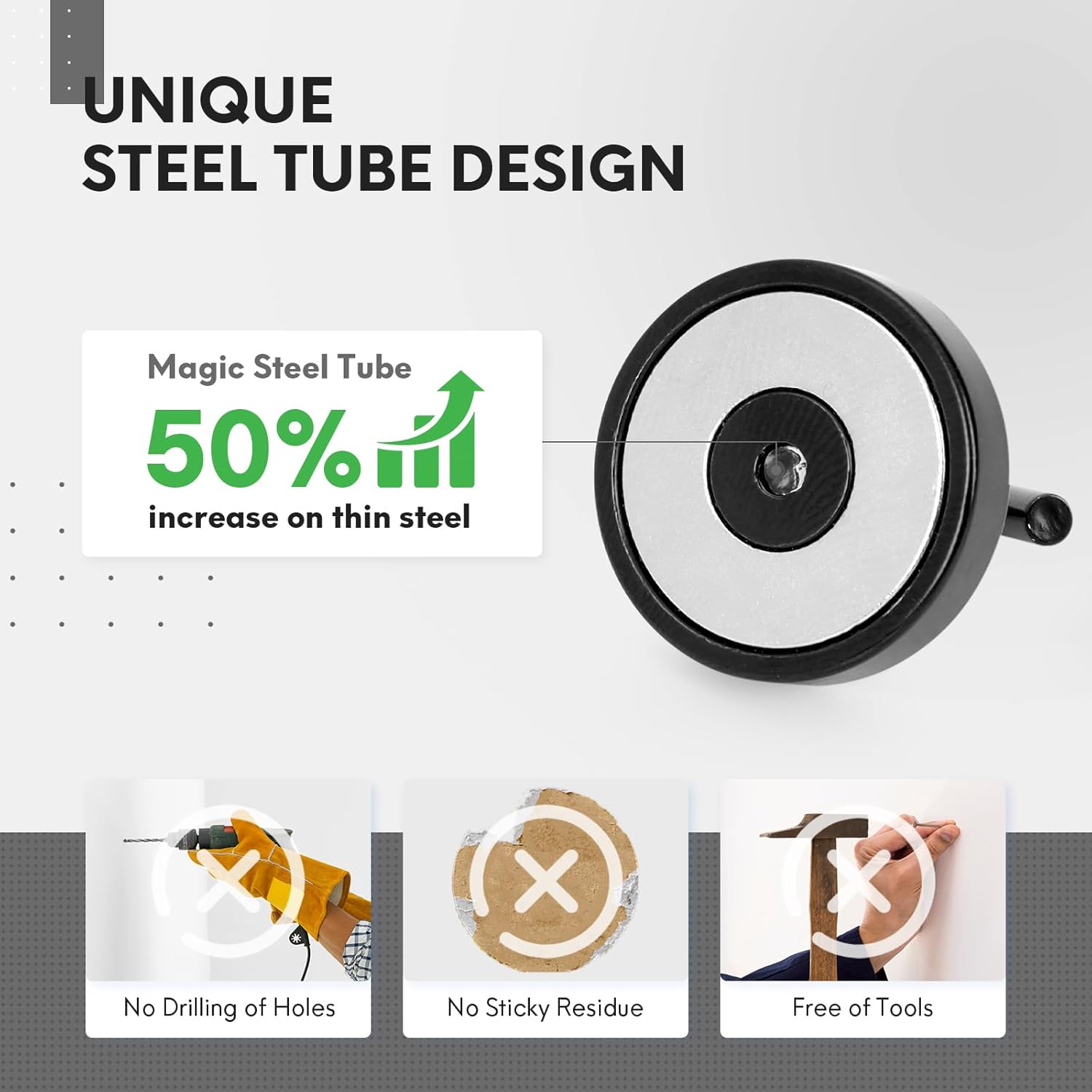 - ✔MAGIC STEEL TUBE DESIGN - Unique design of steel tube inside the base of magnetic hooks greatly increases the attractive force , especially on thin steel! It increase approximately 50% force comparing those none-tube magnets. it solves the problem of weak force on thin steel. Permanent magnetic hook with magic steel tube, strong magnetism lasts forever!