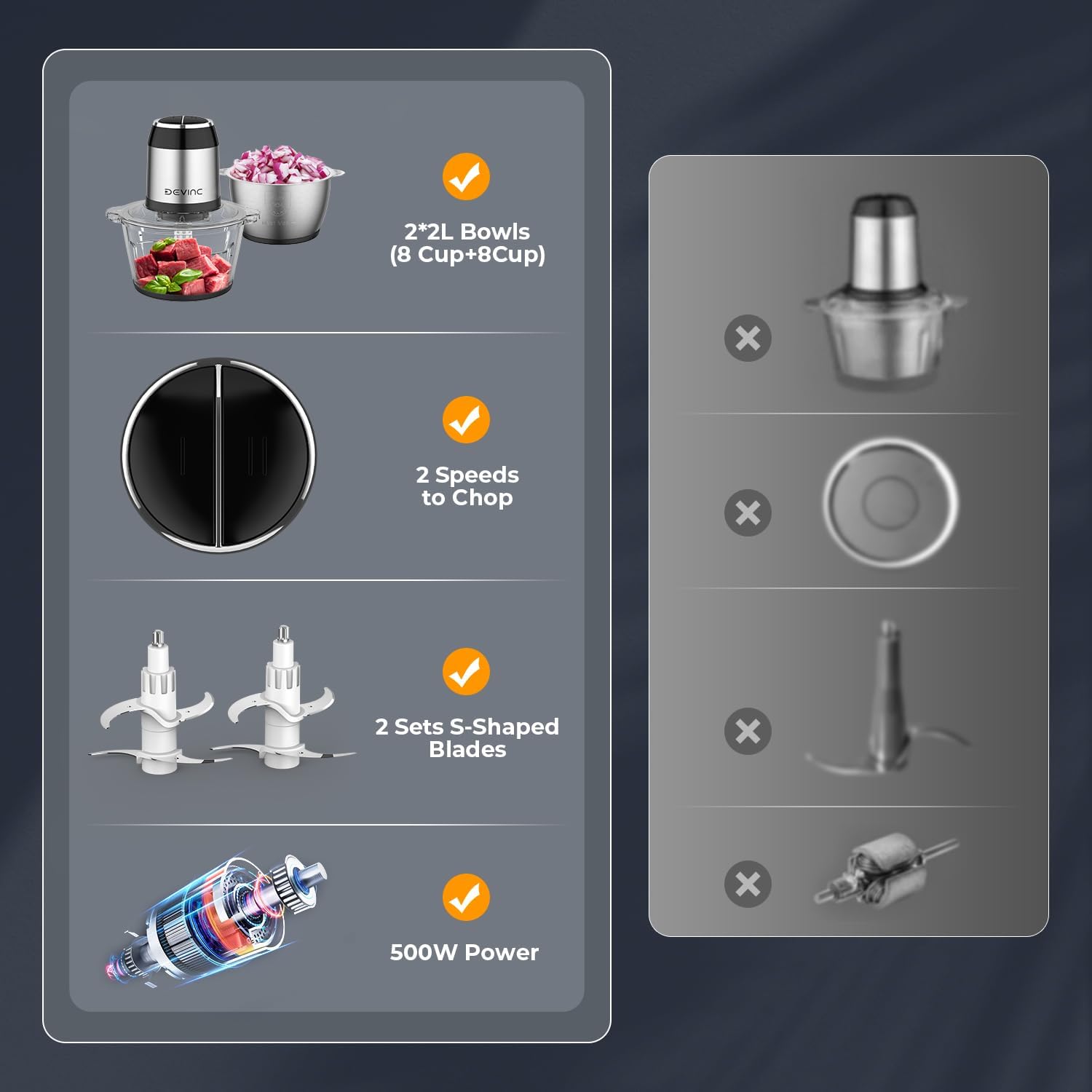 - 【2 Set 8 Cups Bowls with 2 Set Stainless Steel Blades】A 2l stainless steel bowl and a 2l glass bowl can handle different ingredients separately to avoid stringing of flavors. Equipped with 2 s-shaped blades for more efficient handling of ingredients.
