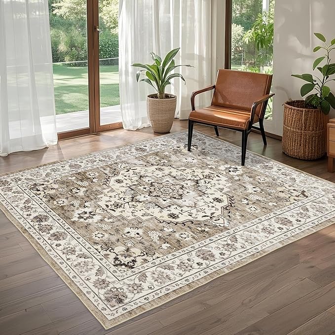Area Rug for Living Room - Vintage Indoor Machine Washable Rug for Bedroom Dinning Room Floor - Soft Low-Pile Carpet Non-Slip Backing Floral Rugs for Office (Ivory/Beige, 6' × 9')