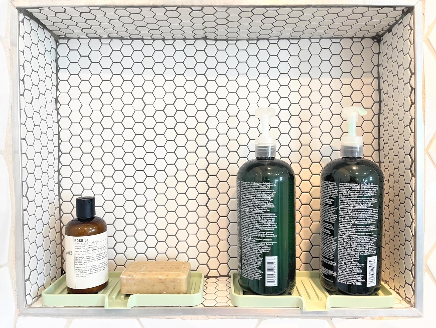 - A More Hygienic Home | A dedicated space for your dishwashing supplies, bathroom sink items, shower niche/shelf items. Tray and drain chute are slightly sloped to help funnel excess water away.Thick, sturdy base stays in place without suction while raised lines promote air flow, so items dry faster and are less prone to developing nasty odors.