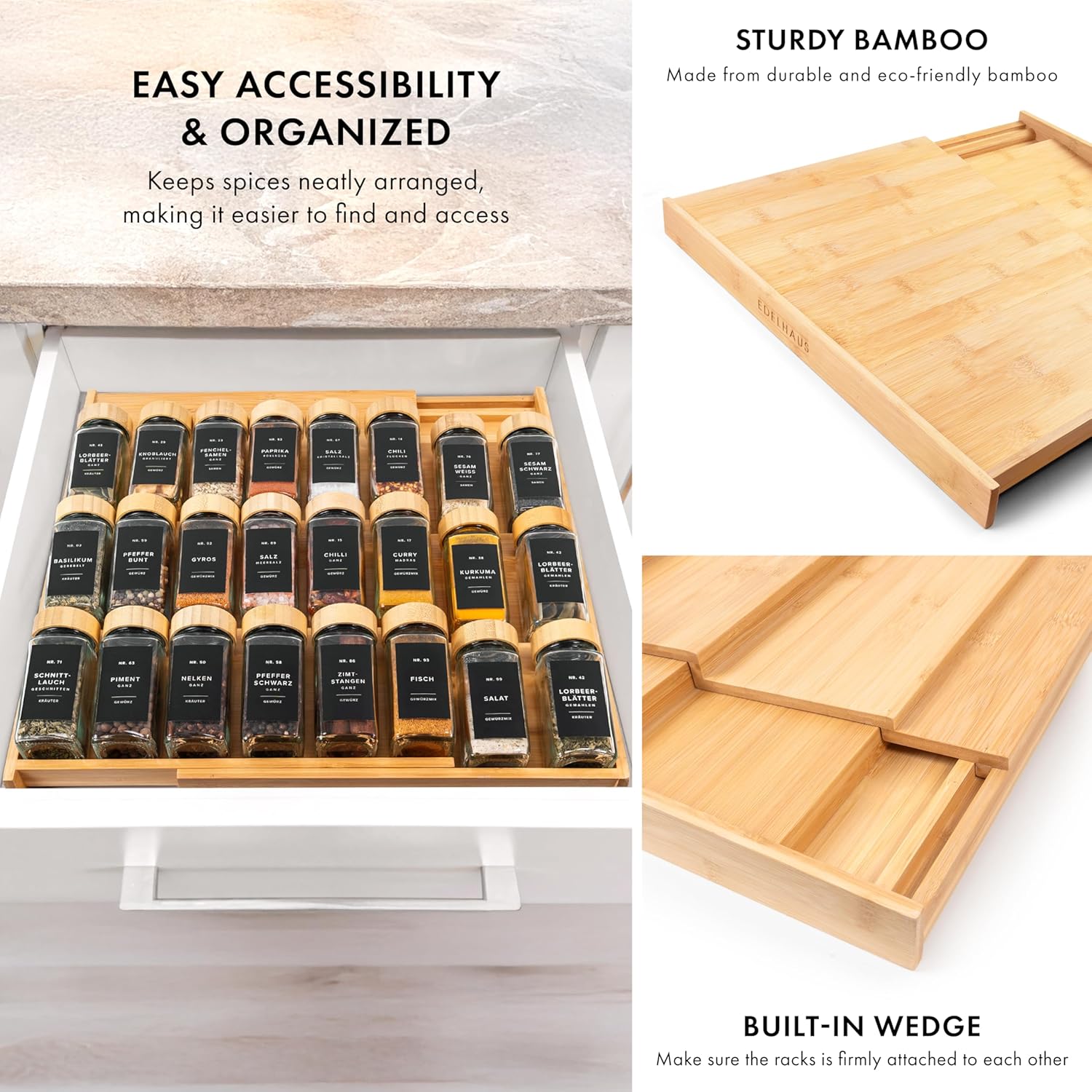 - DURABLE SEASONING RACK: Made from strong natural bamboo, this spice organizer drawer is lightweight, resistant to warping and staining, and easy to clean, perfect for maintaining an organized kitchen.