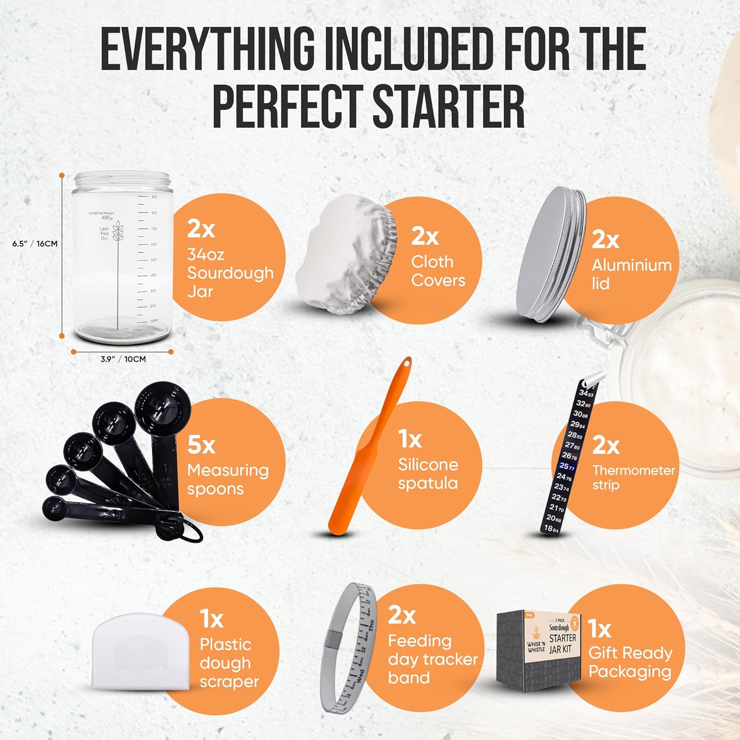 - ALL YOU NEED IN ONE HANDY KIT – This complete sourdough starter kit includes 2x 34 oz fermentation jars, 5x measuring spoons, silicone spatula, metal lid, cloth cover, thermometer strip, feeding band, bread lame, scrapers, and an electronic guide: a must-have bread starter kit and Sourdough Bread Baking Supplies for beginners and pros.