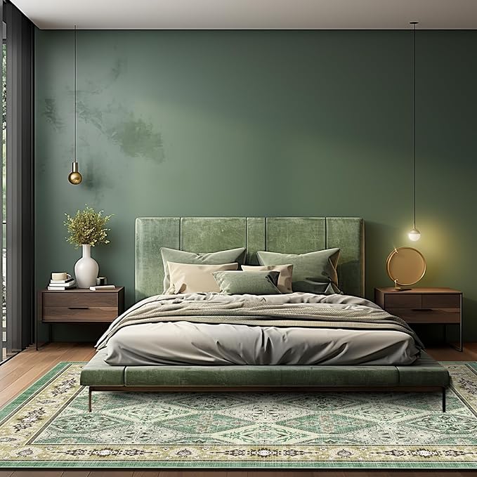 Area Rug for Living Room - Vintage Indoor Machine Washable Rug for Bedroom Dinning Room Floor - Soft Low-Pile Carpet Non-Slip Backing Floral Rugs Office (Green, 8' × 10')