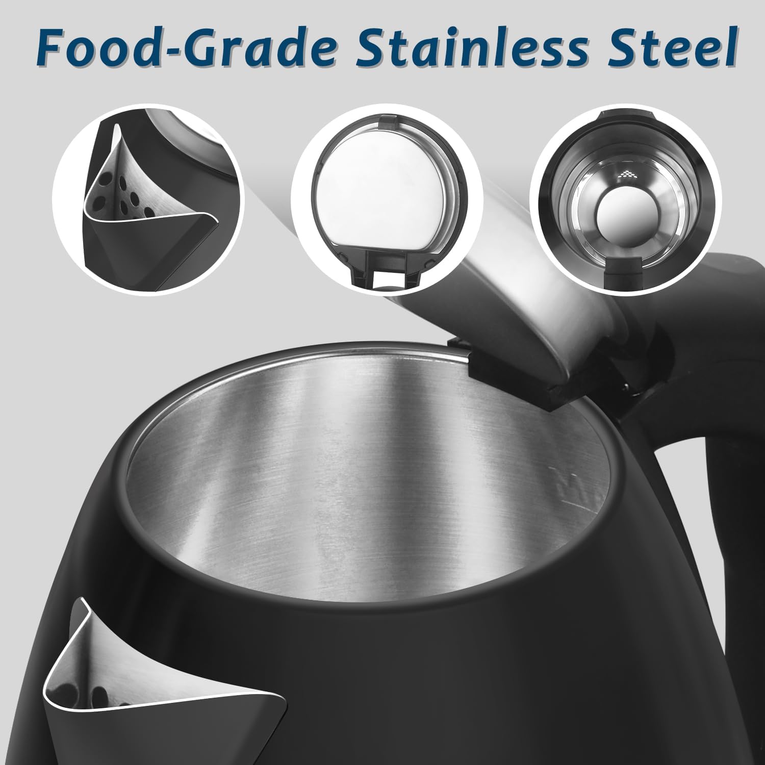- [Friendly & Modern Design]: With its comfortable silicone handle and kettle spout designed with a filter hole, this electric kettle helps prevent burns when handling. The 360° rotating base, equipped with a power cord that can be wrapped around it, ensures safe use and convenient storage. The sleek and modern design of the black stainless steel surface is more favored by young people.