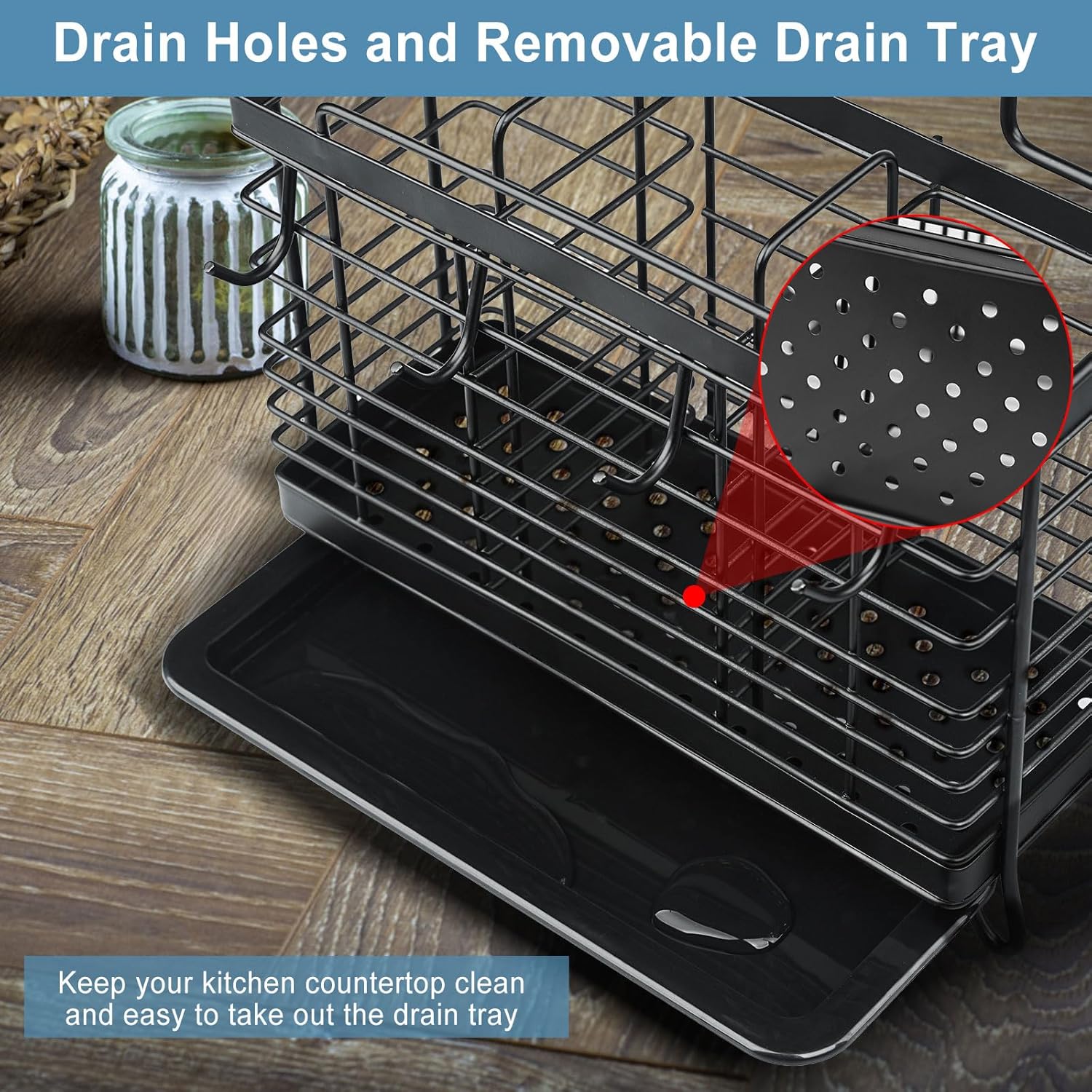 Utensil Holder, Stainless Steel Utensil Drying Rack with Drain Tray, Kitchen Counter Drainer Basket Silverware Cutlery Flatware Holder Forks, Knives, Spoons, Chopsticks Organizer (Black)
