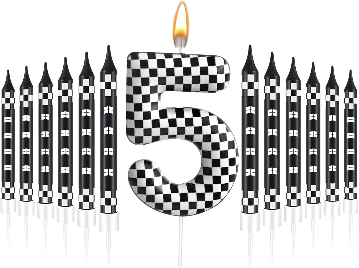 13 Pcs Racing Cars Themed Birthday Candles Black and White Race Number 5 Checkered Candle Cake Topper for Racing Car Party Decoration Supplies (Number 5)