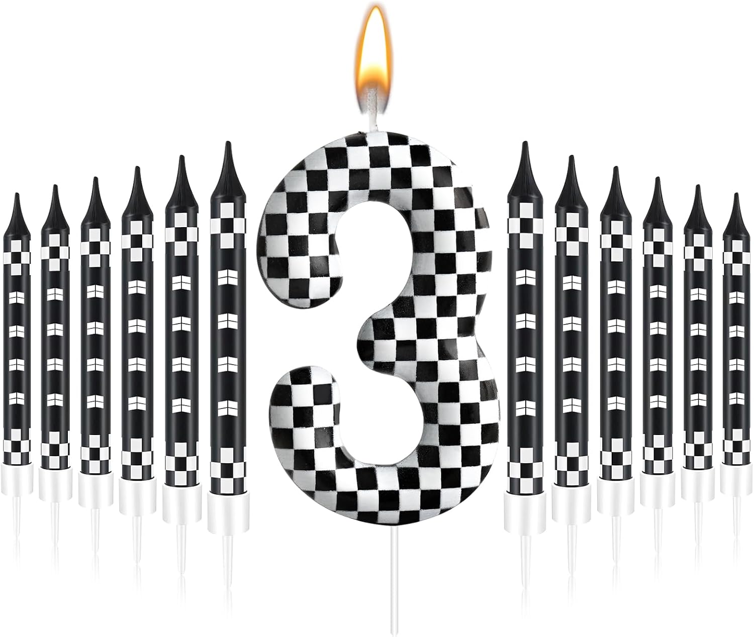 13 Pcs Racing Cars Themed Birthday Candles Black and White Race Number 3 Checkered Candle Cake Topper for Racing Car Party Decoration Supplies (Number 3)