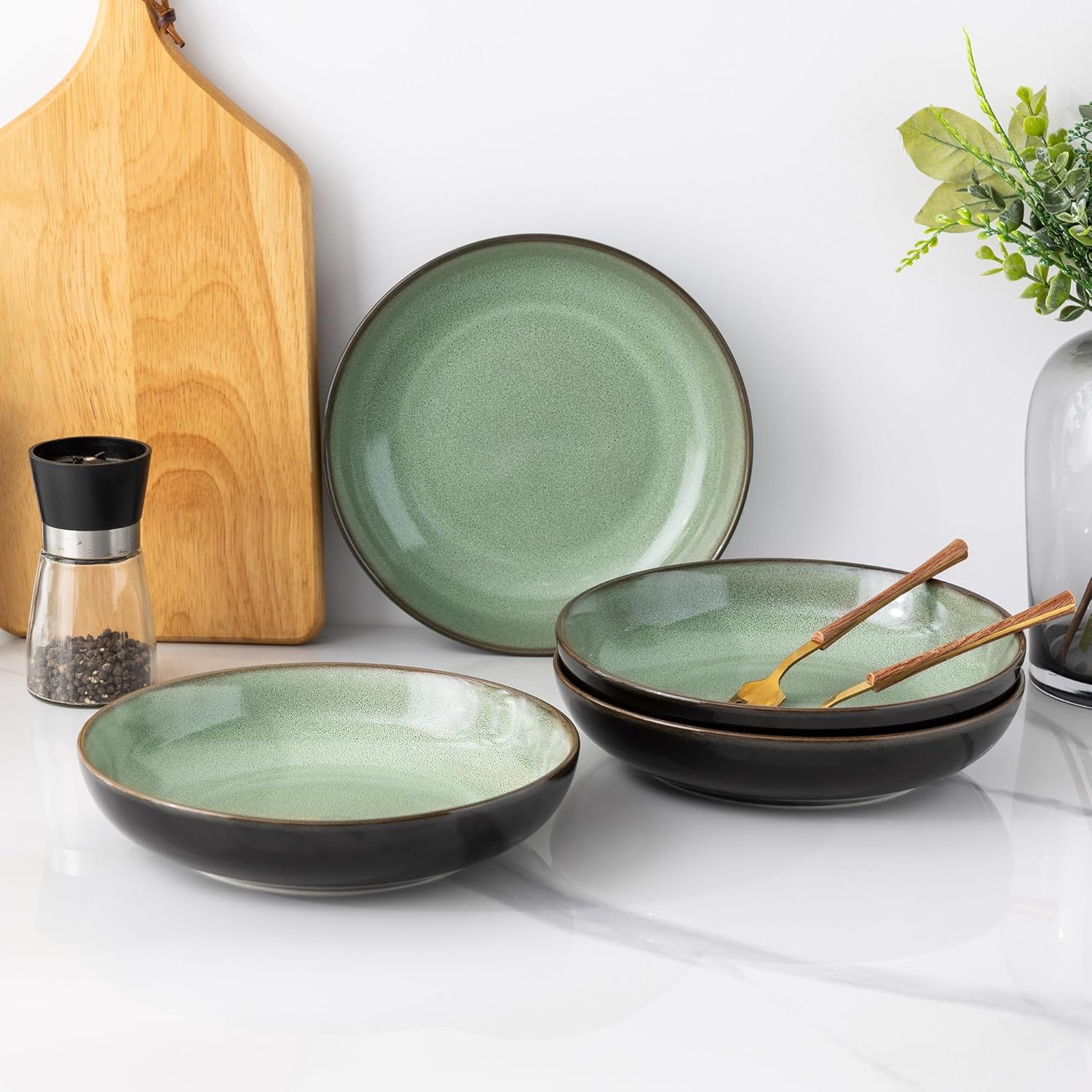 - 【UNIQUE AND SCRATCH RESISTANT】 Our bowls sets are fired with two different glazes,The reactive glaze make every plate is unique,Since our glaze is all-natural reactive finish, the surface of plates would change color on lighting,So Our glaze is also extra strong to prevent scratches from your knives and forks