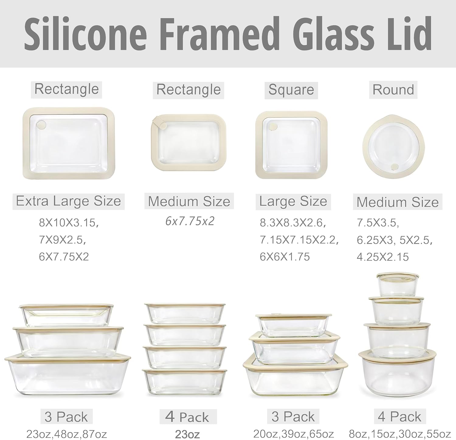 - ✅WHAT’S IN THE BOX: Each set comes with the Glass containers and their matching Silicone Framed Glass Lids. Rectangle Shape Size : 4 Pack of 23oz, ( 6x7.75x2)