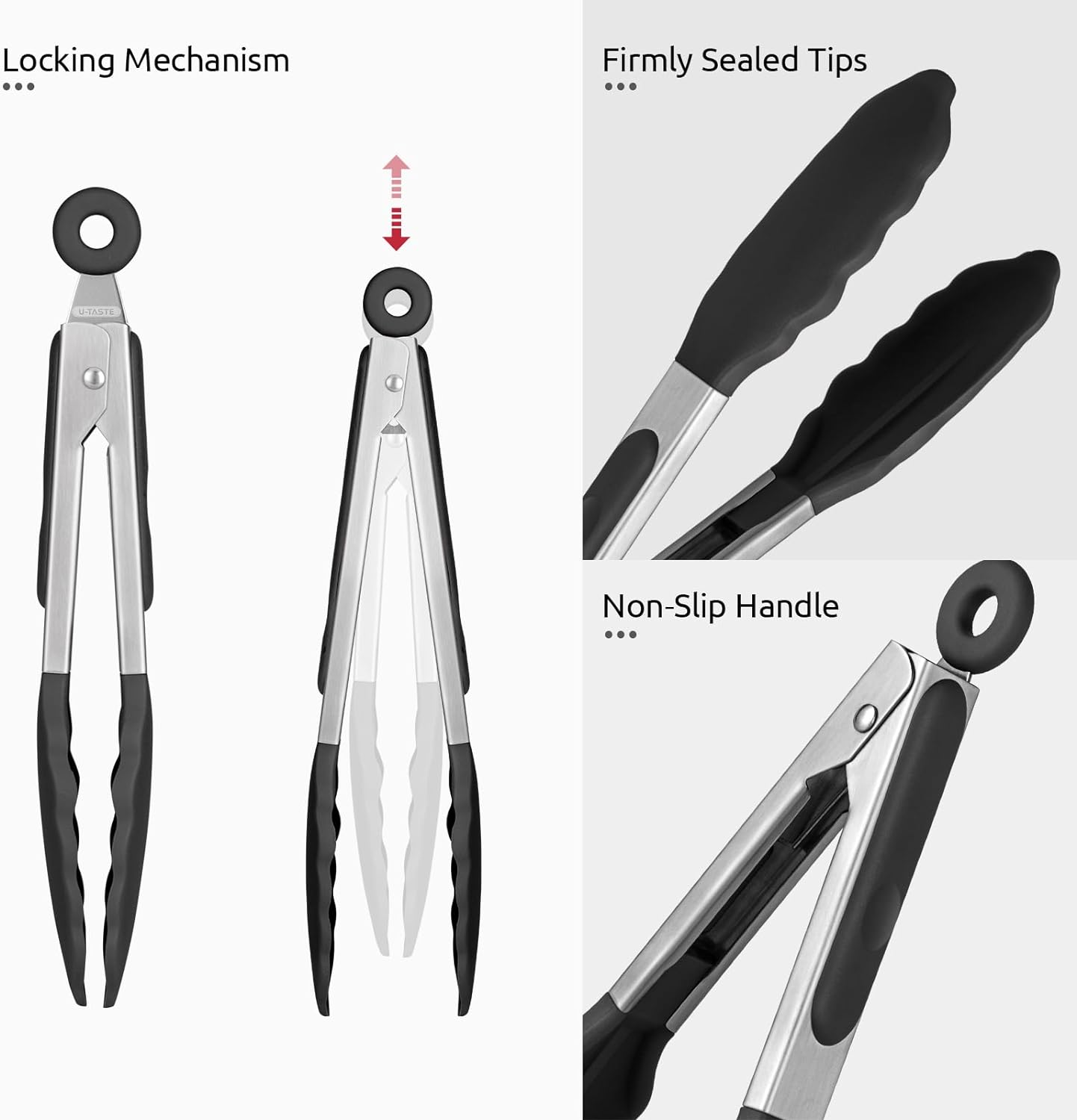 480ºF Heat Resistant Kitchen Tong: U-Taste 7 inch Silicone Cooking Tong with Firm Sealed Non Stick Rubber Tips & Silicon Coated 18/8 Stainless Steel Handle & Smooth Locking for Serving Salad (Black)