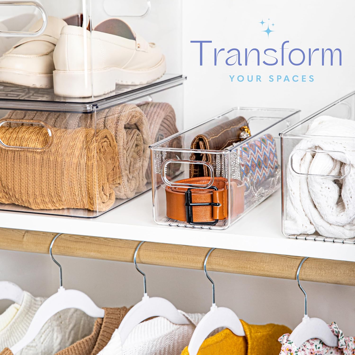 Plastic Food Storage 4 Pack Clear Container Bin with Handles for Organizing Kitchen, Pantry, Refrigerator, Freezer, Pantry, Cabinet, Closet, Bathroom. 14”x4”x4”