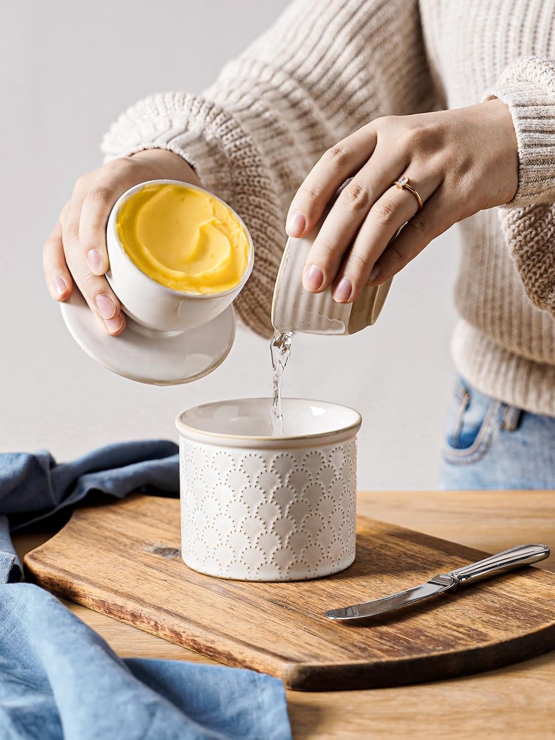 - Exquisite Counter Decorations: Featuring an arctic white glaze adorned with a charming embossed pattern, this farmhouse-style ceramic butter crock will infuse warmth and vitality into your counter. Its cute and elegant design suits various home styles. It's also the ideal present, whether for a housewarming celebration, Thanksgiving, Christmas, or a birthday, it will be an amazing choice