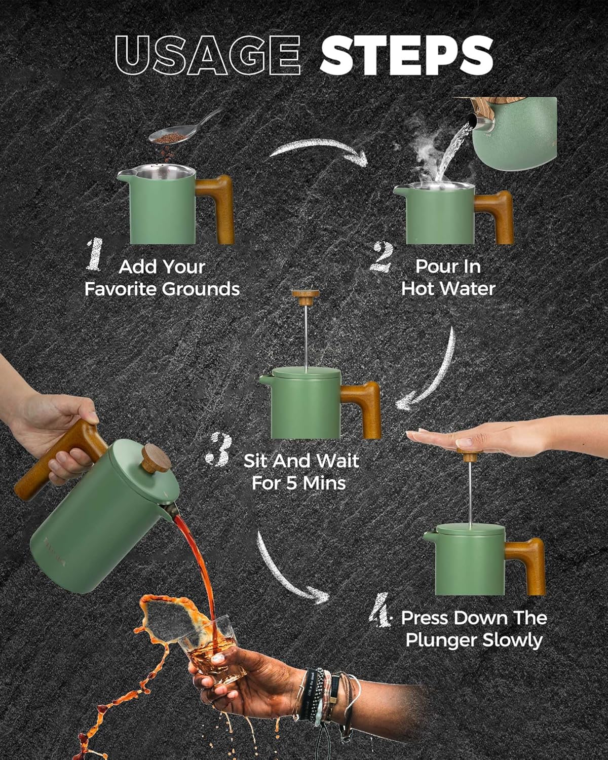 - KITCHEN GRADE STAINLESS STEEL MATERIAL: Crafted from high-quality stainless steel,the French Press is not only aesthetically pleasing with its sleek finish but also durable enough for both indoor and outdoor use. The 21 ounce capacity is suitable for different scenarios such as breakfast, working or camping.