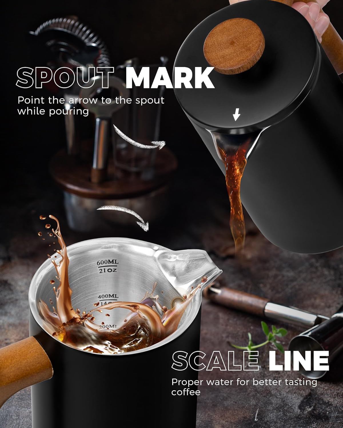 - THERMAL INSULATION: The double-walled vacuum layer construction of the french press keeps coffee hot for longer while ensuring the exterior remains cool to the touch. The spout indicator on the lid helps identify if the spout is closed to maintain coffee temperature.