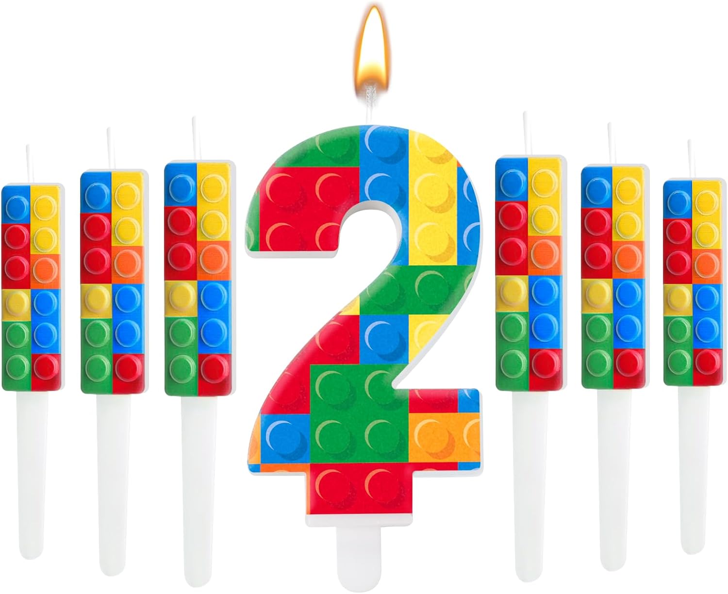 AXBMM 7 Pcs Building Block Themed Birthday Candles Set Building Blocks Number 2 Candle Cake Topper for Building Block Party Decoration Supplies (Number 2)