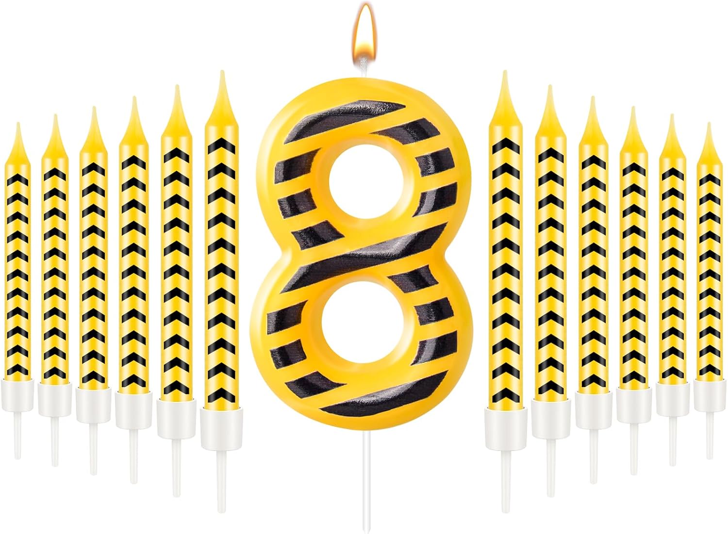 - The Package Includes: You will receive 12 yellow and black striped construction themed birthday candles and 1 number 8 candle, Sufficient quantity for birthday cake decoration or party celebration and daily use, note: the candle will melt after burning, so it is recommended not to leave it on the cake for too long