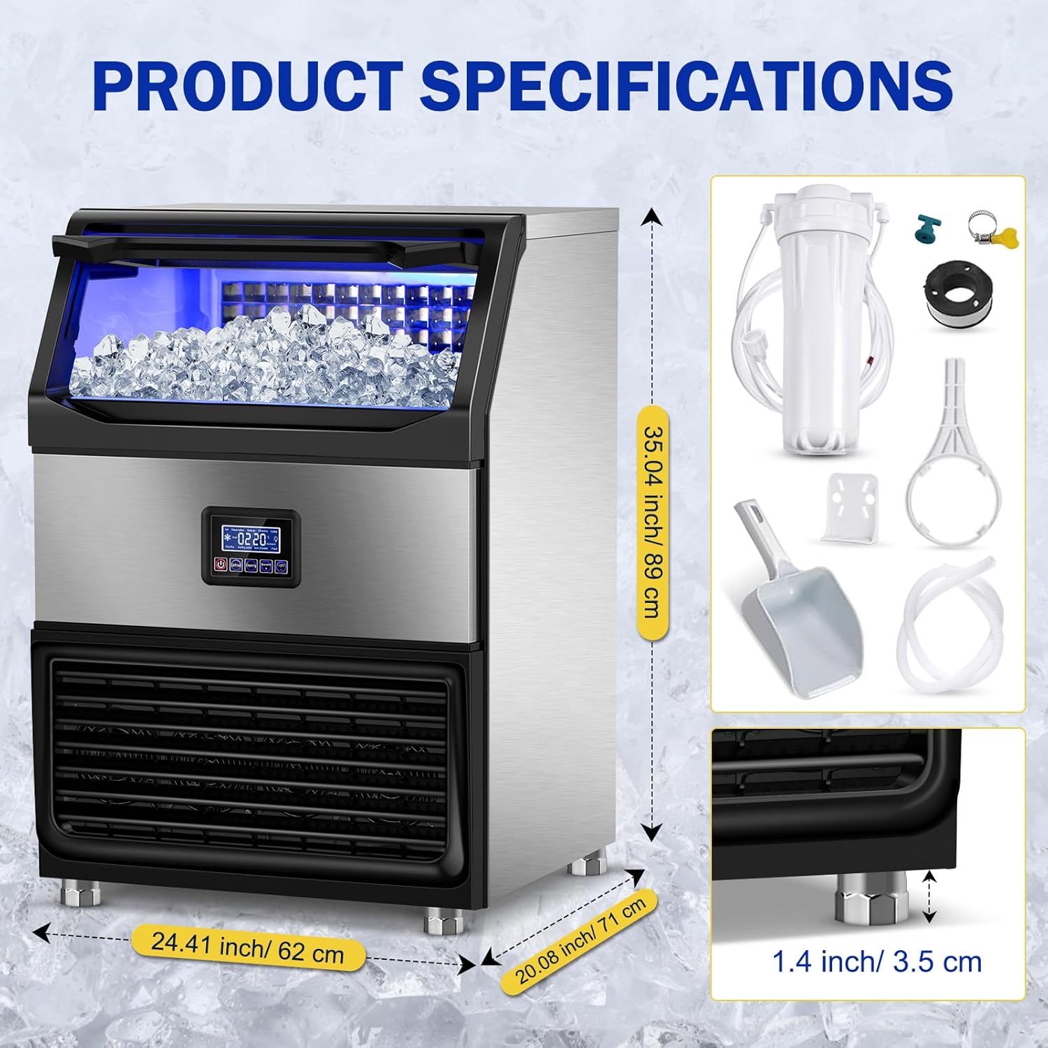- Easy Installation and Use - This commercial ice maker machine comes with a full set of accessories. Simply connect the inlet and drain hoses, and it will automatically fill and drain the water. Start the ice-making cycle with ease. NOTE: Our stainless steel ice machine has a scratch-resistant protective film on the surface, which can be kept or peeled off as desired.