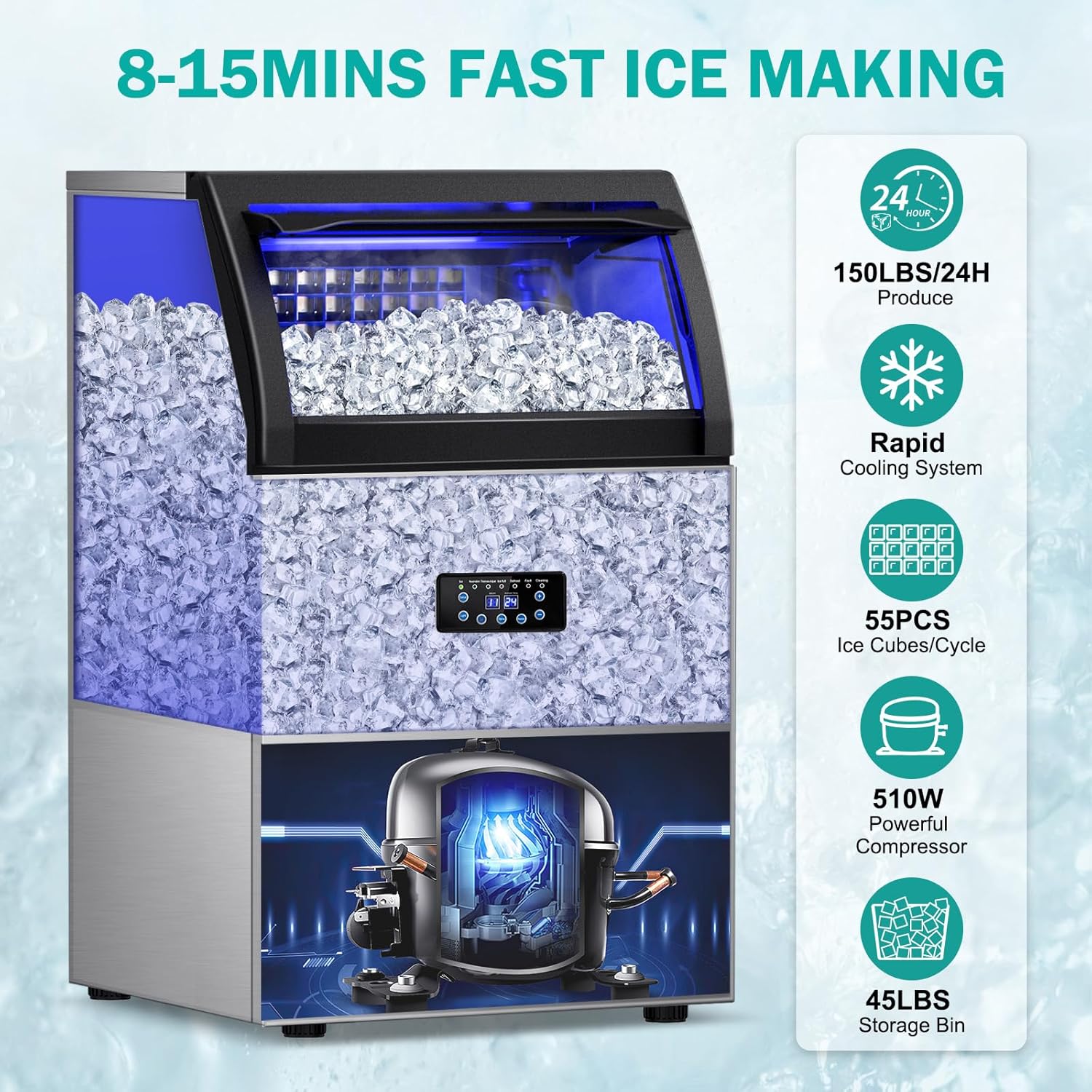 Commercial Ice Maker Machine, 150lbs/24H with 45Lbs Storage Bin, 55Pcs Ice Cubes 8Mins, Tap Add Water Freestanding Ice Maker Commercial for Home Bar Office